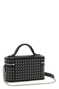 cod. 7P0070WP05821000 'Vanity Falabella' crossbody bag in leather-effect fabric with all-over studs, fixed handle, zip closure, removable chain shoulder strap. SUSTAINABLE: Products that do not use leather respecting cruelty free ethics. Color: Black Size & Fit: W 19 x H 11 x D 8 cm Composition: 100% polyester Made in: Italy