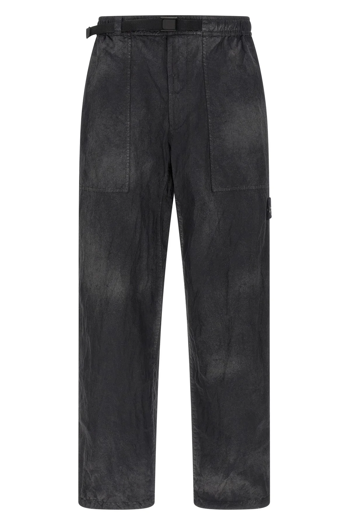 cod. L1S153100040S0359V0029 '3100040' fatigue pants in compact nylon fabric dyed in garment and manually sprayed with a reflective solution containing thousands of glass microspheres that slide on the anti-drip surface of the fabric creating a marbled appearance, elastic waistband with nylon ribbon belt and cam buckle, zip flap, pockets, ' Badge Stone Island Research logo applied on the side, wide leg, drawstring on the leg bottom. The artisan process makes each garment unique and unrepeatable. Color: Black Size & Fit: true to size fit Composition: 100% polyamide fibers Made in: Italy PROMO CODE NOT APPLICABLE