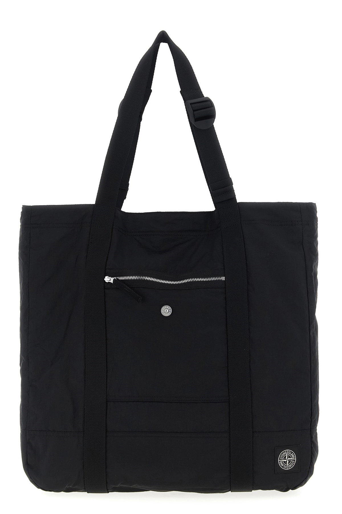 cod. K2S159200013S0251V0029 ECONYL® shopping bag, logo patch and pocket with front zip closure, snap button closure, double adjustable handle. SUSTAINABLE: This product is made of ECONYL regenerated nylon.® Color: Black Size & Fit: W 41 x H 42 x D 9.5 cm Composition: 100% polyurethane Made in: Indonesia