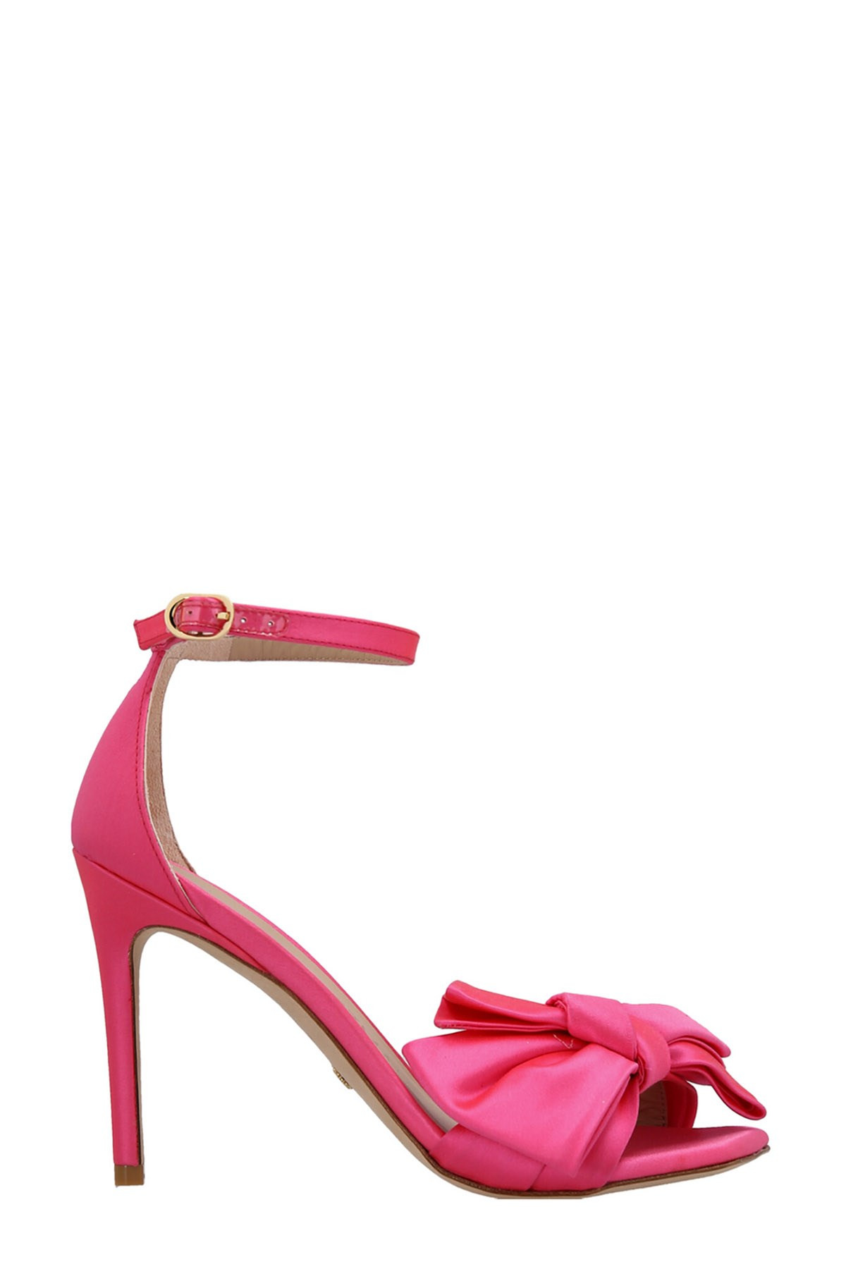 cod. SD855PEONIA 'Nudistcurver Loveknot' satin sandals with front bow detail, ankle strap, heel. Color: Fuchsia Main: 100% satin Made in: Spain Size & fit: EU WOMAN Heel: 10 cm