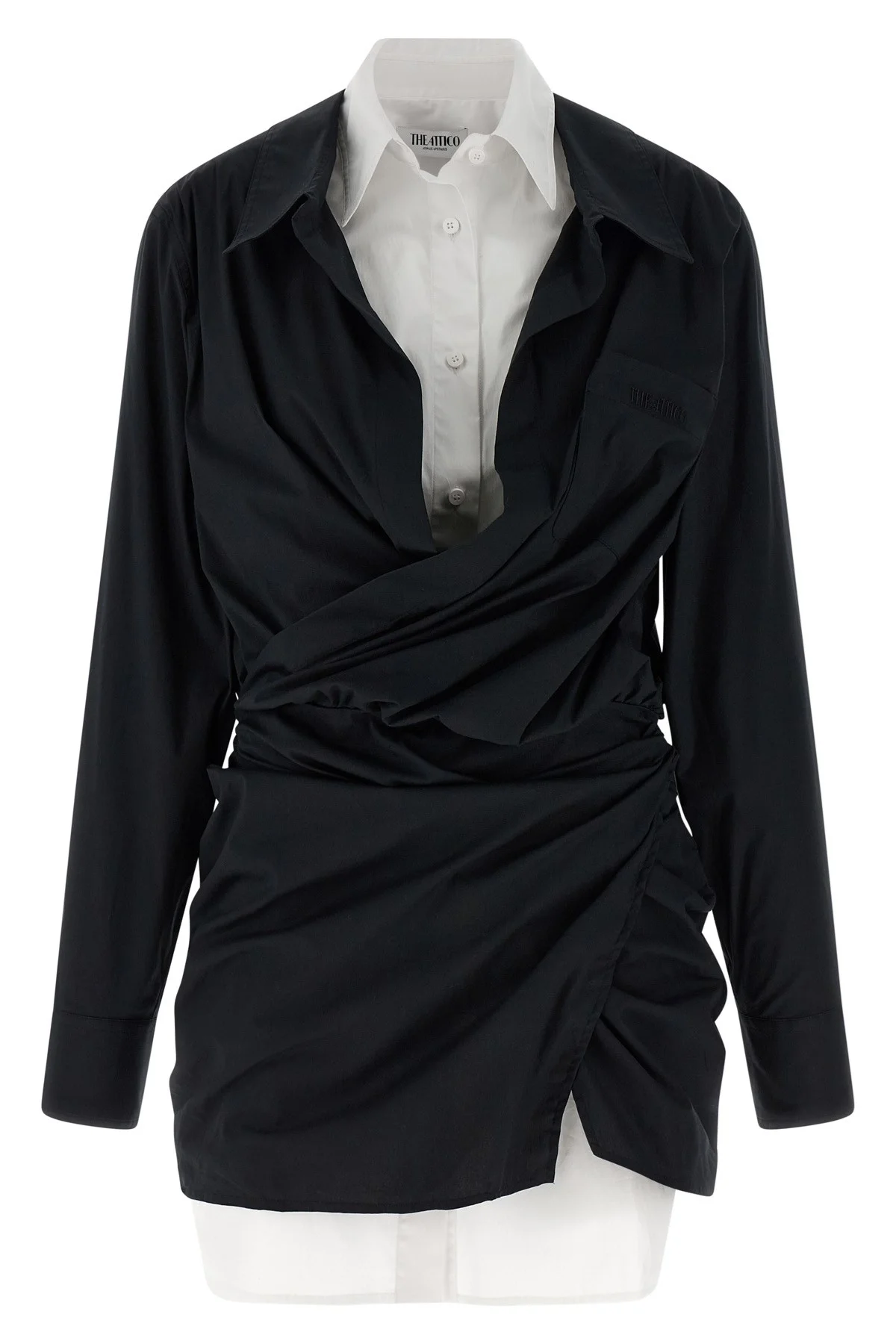 cod. 260WCA00458414 Double layer mini dress in stretch cotton poplin, chemisier model, logo embroidery and front button closure, long cuffed sleeves, and asymmetrical hem. Color: White/Black Size & Fit: true to size fit Composition: 97% cotton, 3% elastane Made in: Italy