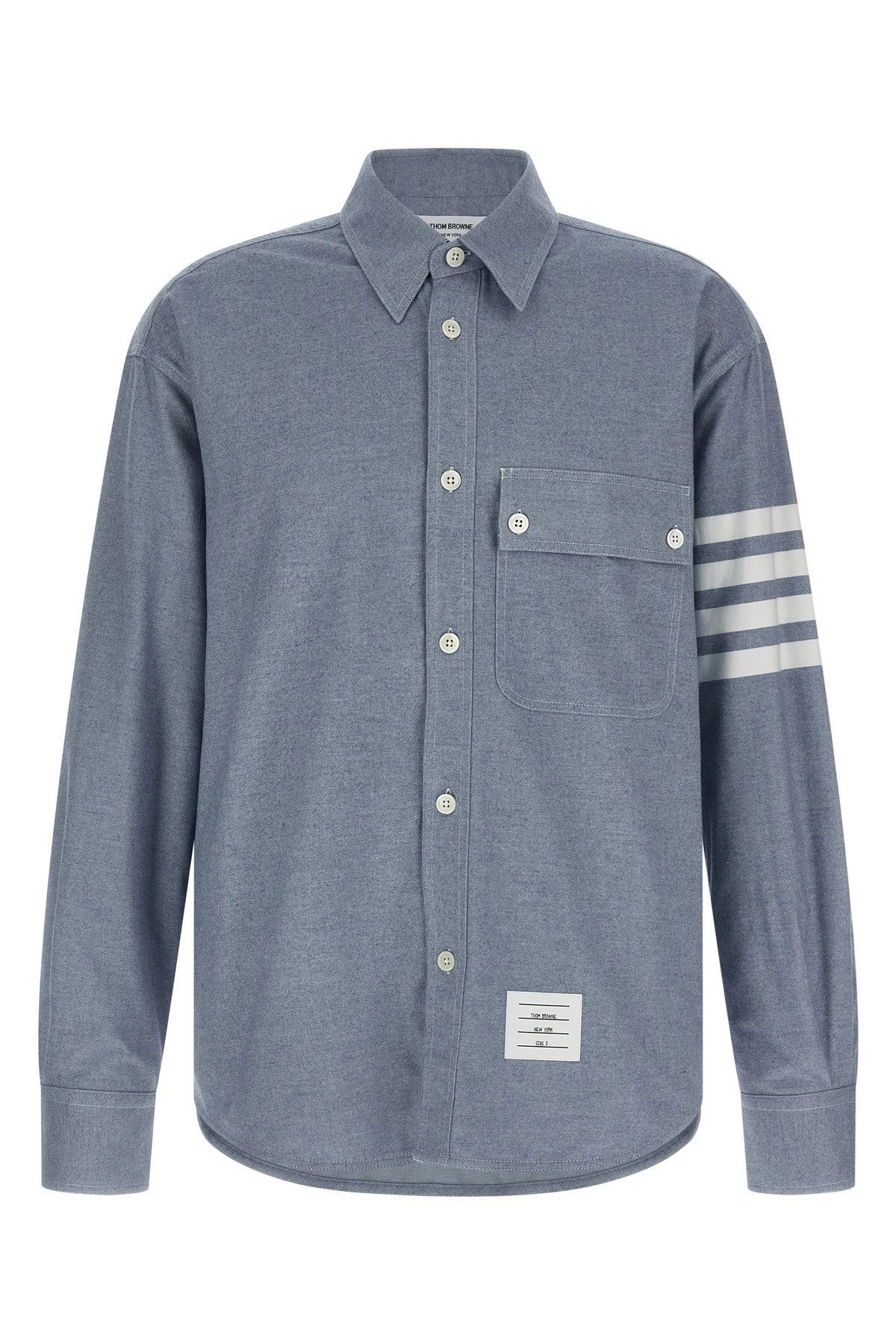cod. MWL420AF0325480 Cotton flannel shirt, logo patch and front button closure, breast pocket, long cuffed sleeves and '4BAR' intarsia, RWB grosgrain detail at the back. Color: Light Blue Size & Fit: oversized fit Composition: 100% cotton Made in: Italy