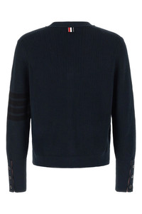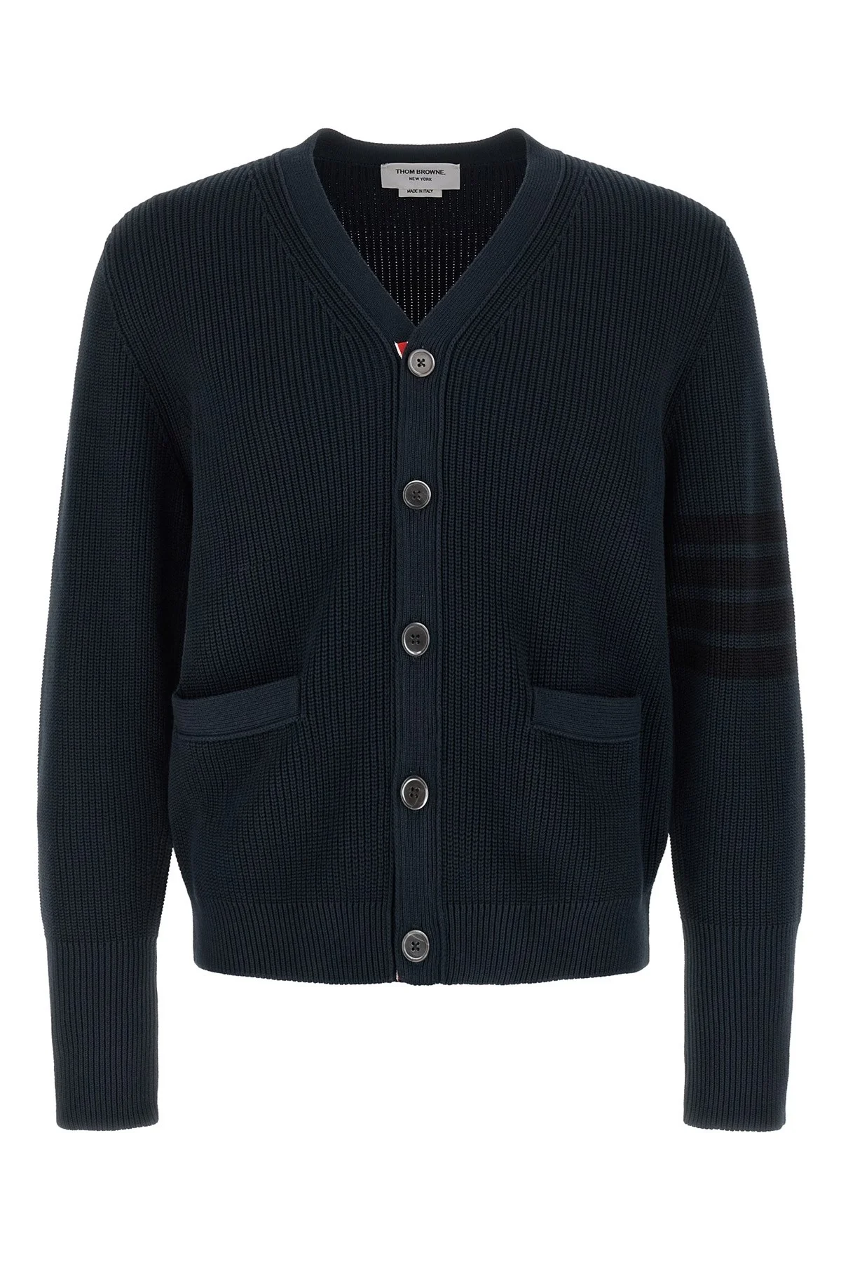 cod. MKC635AY3065415 Garment Dye' cotton knit cardigan with dense weave, 4 bar detail on the sleeve, V-neck with RWB grosgrain detail, front button closure, long sleeves with cuffs and buttons. Color: Blue Size & Fit: True to size fit Composition: 100% cotton Made in: Italy