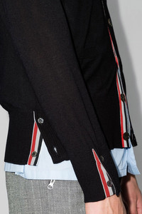 cod. MKC002AY1014415 Merino wool cardigan with buttons, V-neck, long sleeves and a '4 bar' detail. Color: Blue Fabric: 100% merino wool Made in: Italy Size & Fit: True to size PROMO CODE NOT APPLICABLE