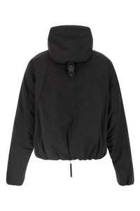 cod. MJ74BLACK 'M J 74' water-repellent peach hand cotton blend jacket, viscose lining, hood, high neck, front zip closure, pockets, long sleeves with dropped shoulders, elastic hem. Color: Black Size & Fit: Comfort fit Composition: 52% polyester 38% cotton 10% polyamide Made in: Portugal