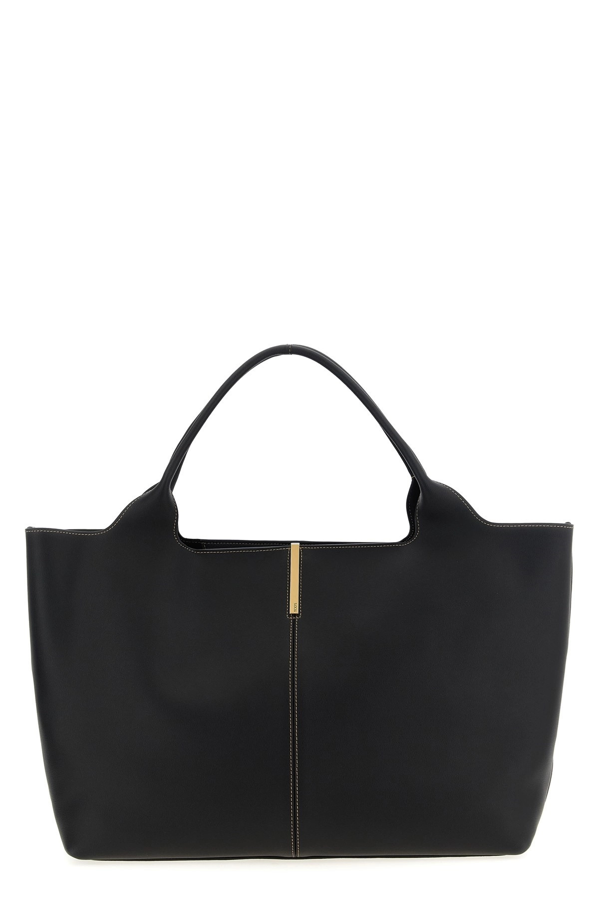 cod. XBWEBRA0300UBLB999 Medium 'EBR' calf leather shopping bag with contrast stitching, metal bar with front engraved logo, double fixed handle, magnetic closure, flat bottom with metal feet. Color: Black Size & Fit: W 48 x H 29 x D 15 cm Composition: 100% calfskin leather (Bos Taurus) Made in: Italy