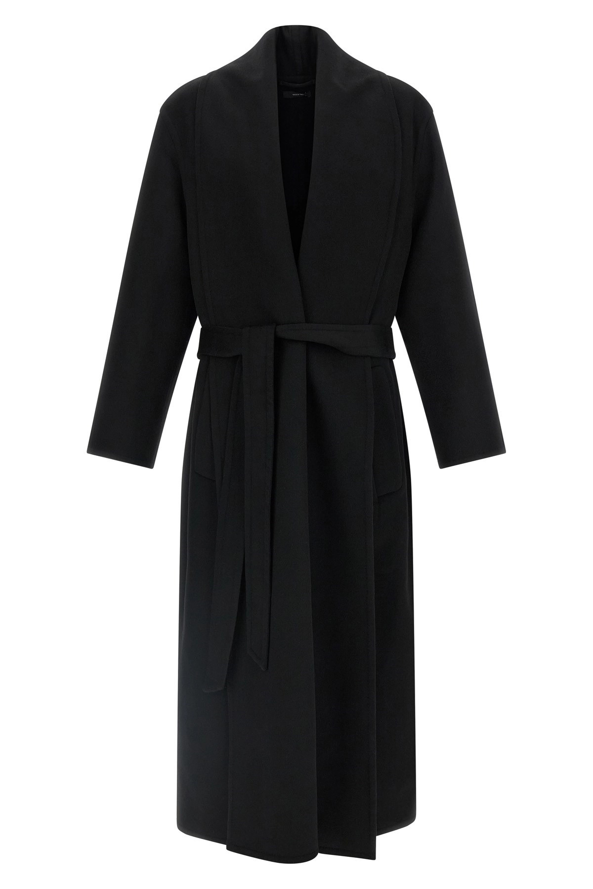 cod. OCL023FMW083LB999 Long coat in wool and double cashmere, unstructured robe model, shawl neck, breast pocket, welt pockets, back split, unlined, removable belt. Color: Black Size & Fit: true to size fit Composition: 90% virgin wool 10% cachemire Made in: Italy