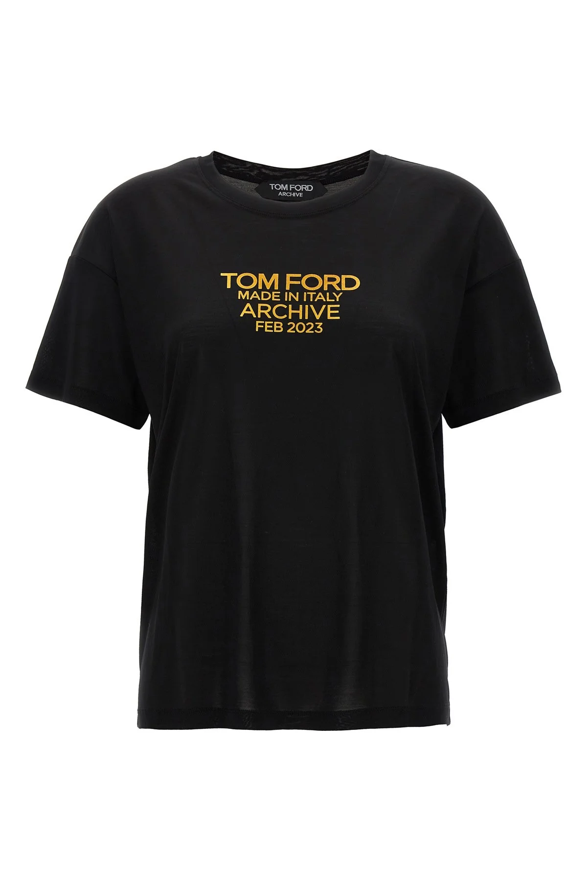cod. TSJ560FAX835XLBGO Silk T-shirt with front logo print, crewneck, and short sleeves. Color: Black Size & Fit: true to size fit Composition: 100% silk
