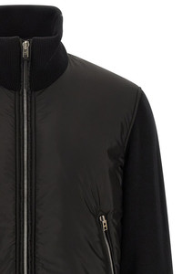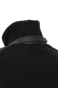 cod. KZY015YMW135NAA Extra fine merino wool bomber jacket with tone-on-tone padded nylon front vest, ribbed stretch knit high neck with tone-on-tone leather back, front zip closure, pockets, long cuffed sleeves, and headband. Color: Black Size & Fit: true to size fit Composition: 90% wool 6% polyamide 4% elastane Made in: Italy