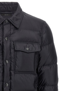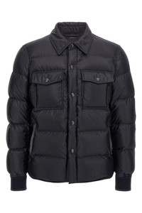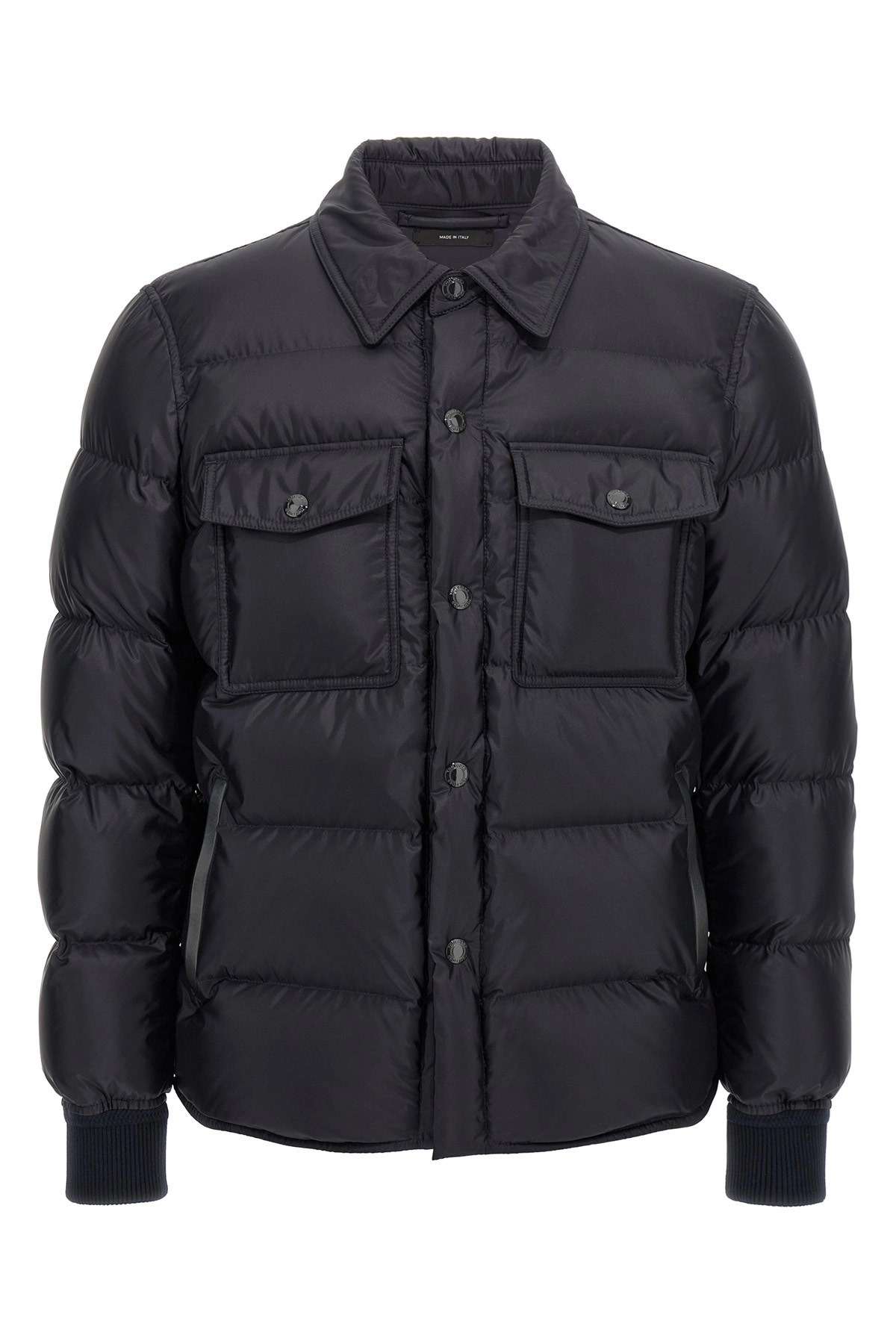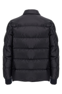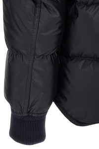 cod. OBD002FMN062HB999 Satin tech fabric jacket with goose feather padding, shirt collar, front snap button closure, pockets, long sleeves with stretch ribbed knit cuffs. Color: Blue Size & Fit: true to size fit Composition: 100% polyester Made in: Italy