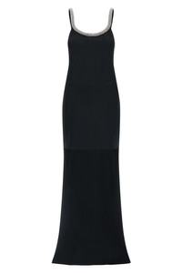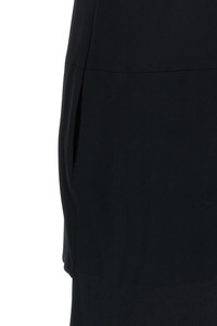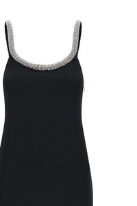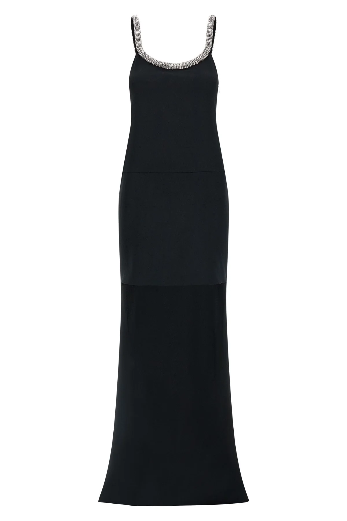 cod. AB3625SDE517NAA Crepe satin dress with asymmetrical hem and long train, wide round neckline at the front and back embellished with crystal braces, sleeveless, side zip closure, pockets. Color: Black Size & Fit: true to size fit Composition: 73% acetate, 27% viscose Made in: Italy