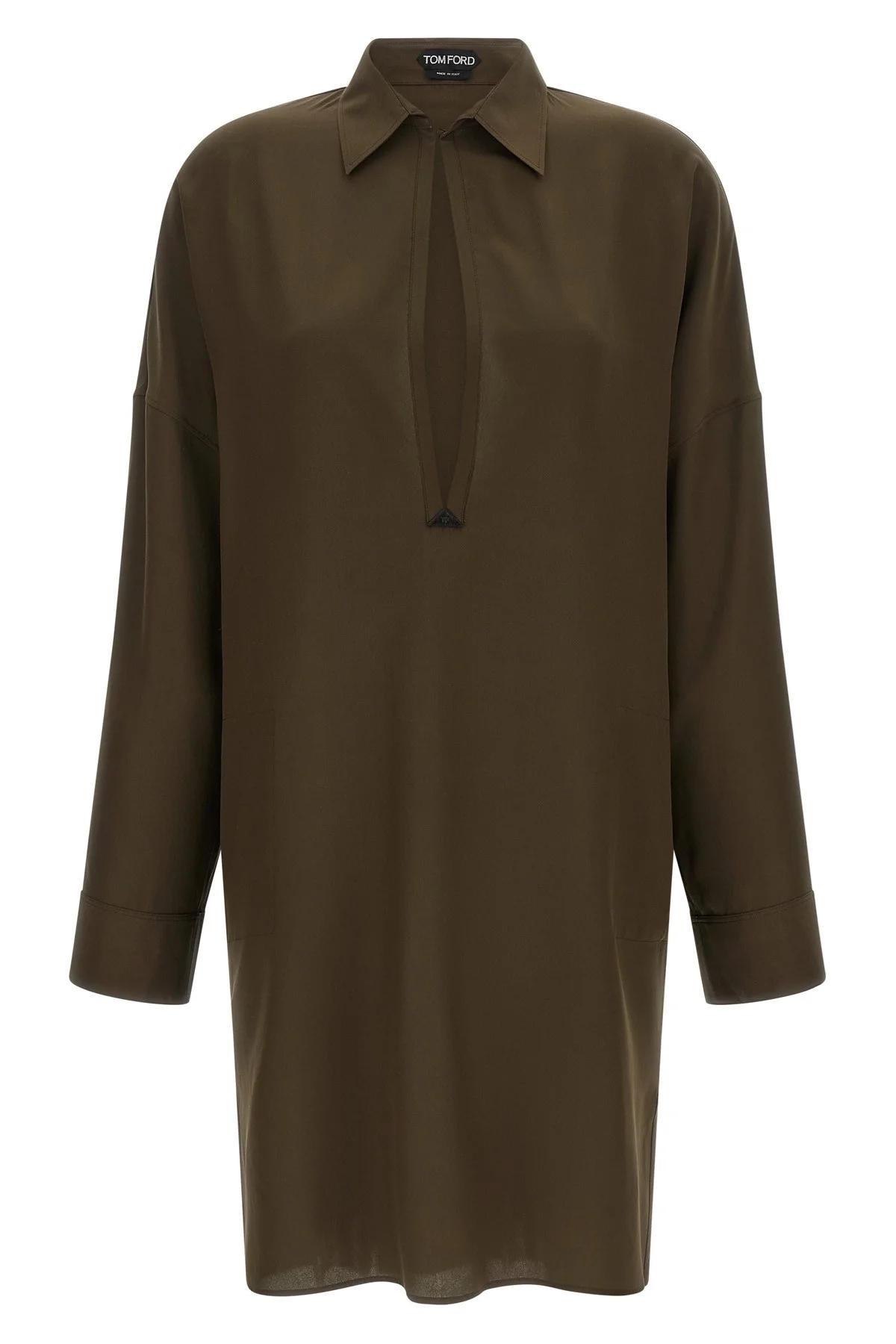 cod. AB3632FAX1703GCW Crepe de chine silk tunic midi dress with tone-on-tone smooth leather details, shirt collar with hook closure and front cut-out detail, long cuffed sleeves, side slits, and asymmetrical hem. Color: Green Size & Fit: true to size fit Composition: 100% silk Made in: Italy