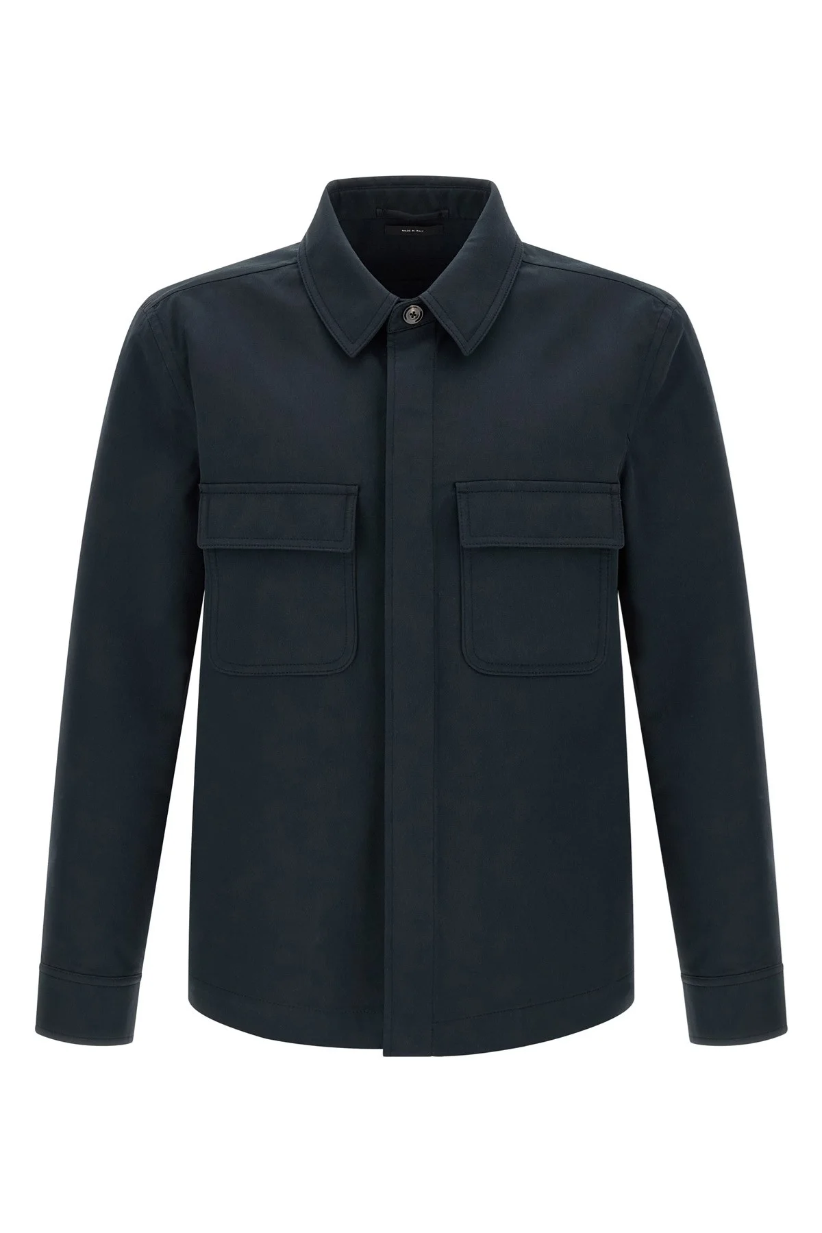 cod. OJS017FMC286UCC Heavy cotton twill overshirt, front concealed button closure, pockets, long cuffed sleeves, side slits. Color: Blue Size & Fit: true to size fit Composition: 99% cotton, 1% polyamide Made in: Italy