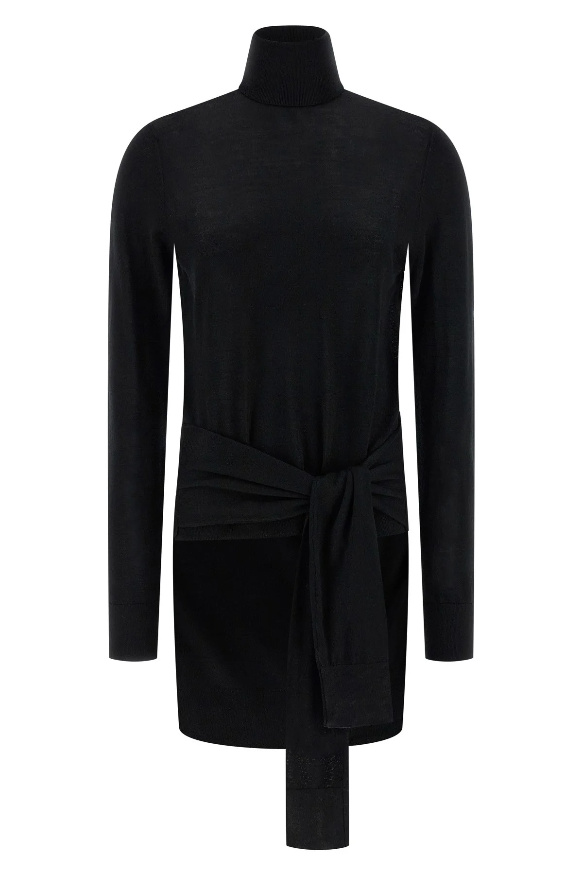 cod. 254WRT0615YA0087001 'Double-Sleeve' cashmere and silk blend turtleneck with turned-up high neck, long cuffed sleeves, trompe l'oeil tone-on-tone sweater at the hem with sleeves to tie at the waist or leave loose. Color: Black Size & Fit: true to size fit Composition: 75% cachemire 25% silk Made in: China