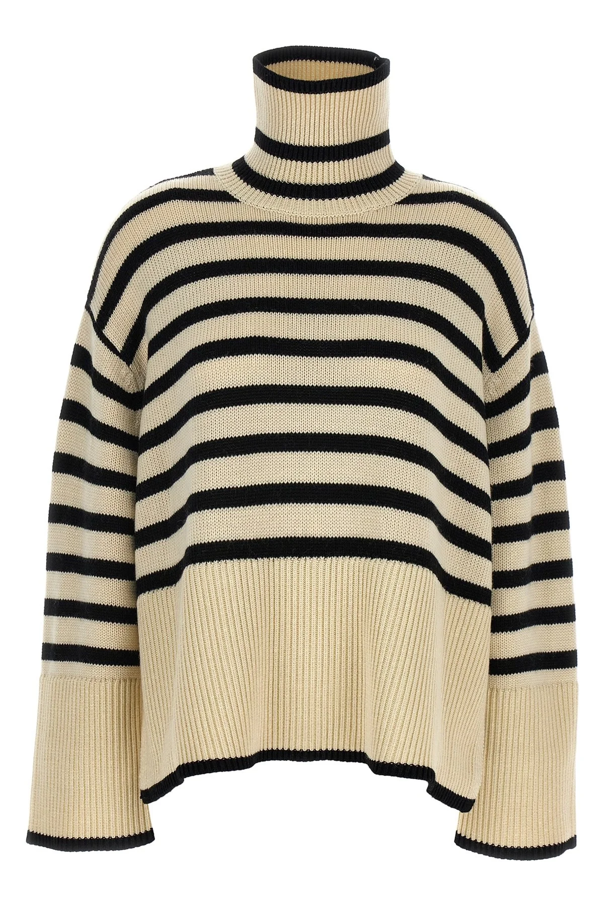 cod. 212562758876 'Signature Stripe' wool sweater with high neck, long sleeves, side splits at the hem. Color: White/Black Size & Fit: Oversizefit Composition: 100% wool Made in: China