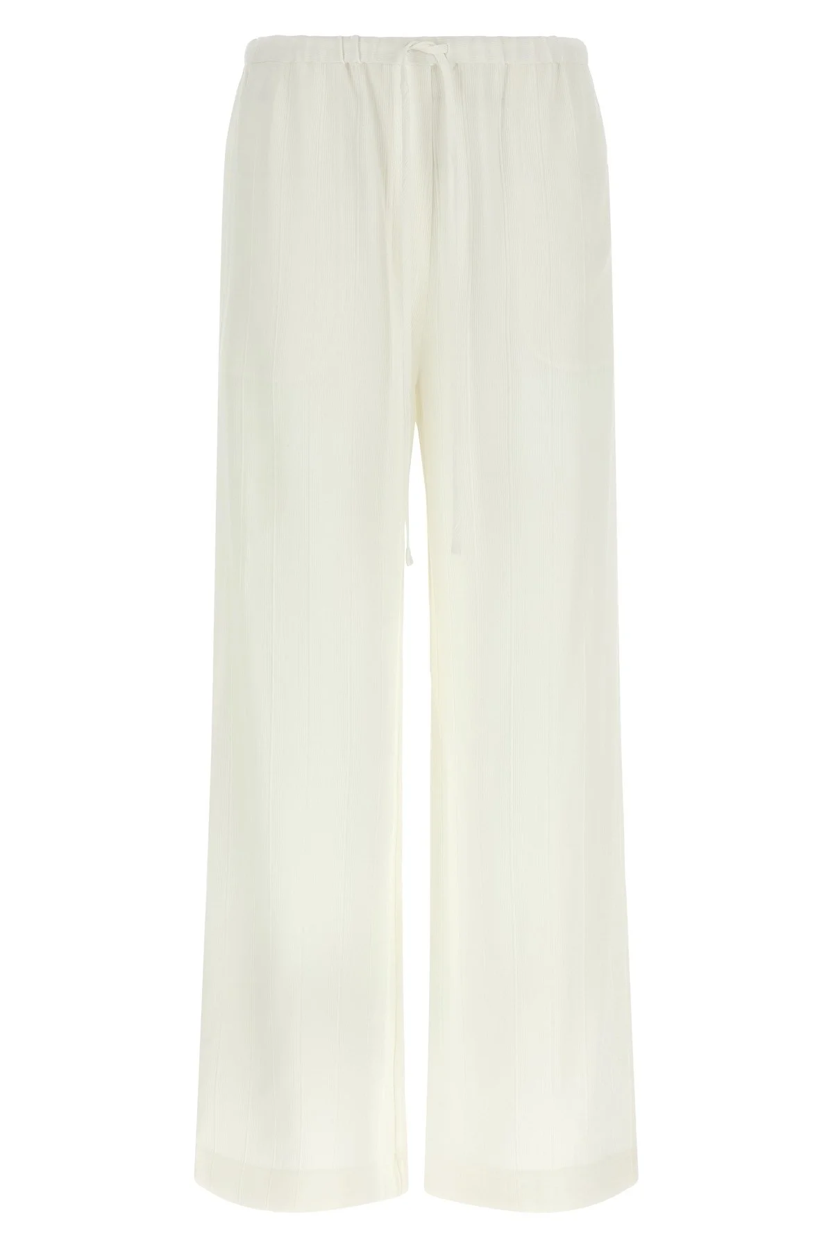 cod. 252WRB1709FB0192188 Viscose and linen blend pants characterized by raised stripes, wide leg, elastic waistband with drawstring, pockets. Color: White Size & Fit: relaxed fit - FRENCH size Composition: 96% viscose 4% linen Made in: China