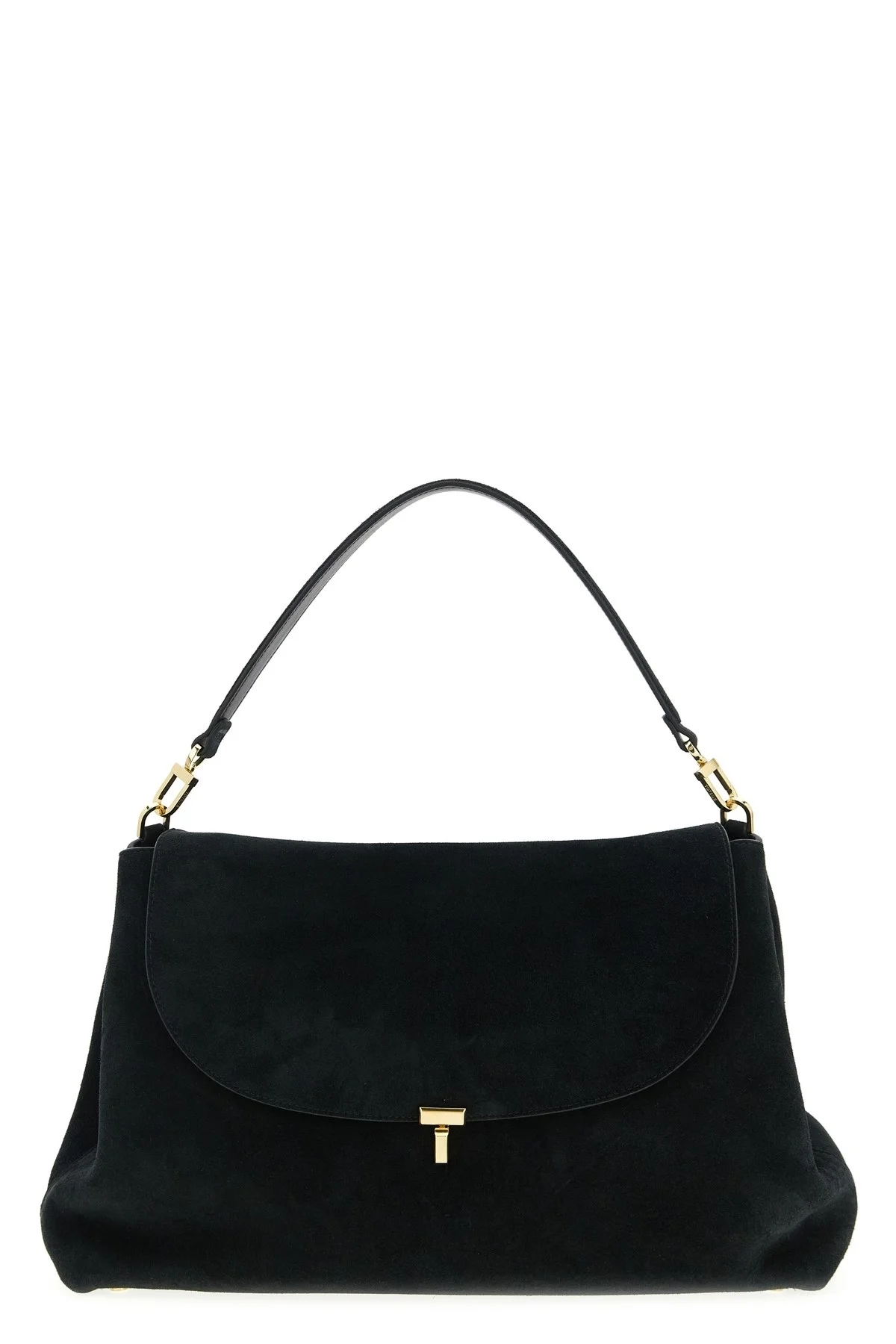 cod. 261WAL0096LE0004001 'T-Lock' suede handbag with curved top flap, fixed handle, front metal turn lock, adjustable and removable shoulder strap. Color: Black Size & Fit: Size&Fit: W 35 x H 17 x D 12 cm Composition: 100% cow leather (Bos Taurus) Made in: Italy