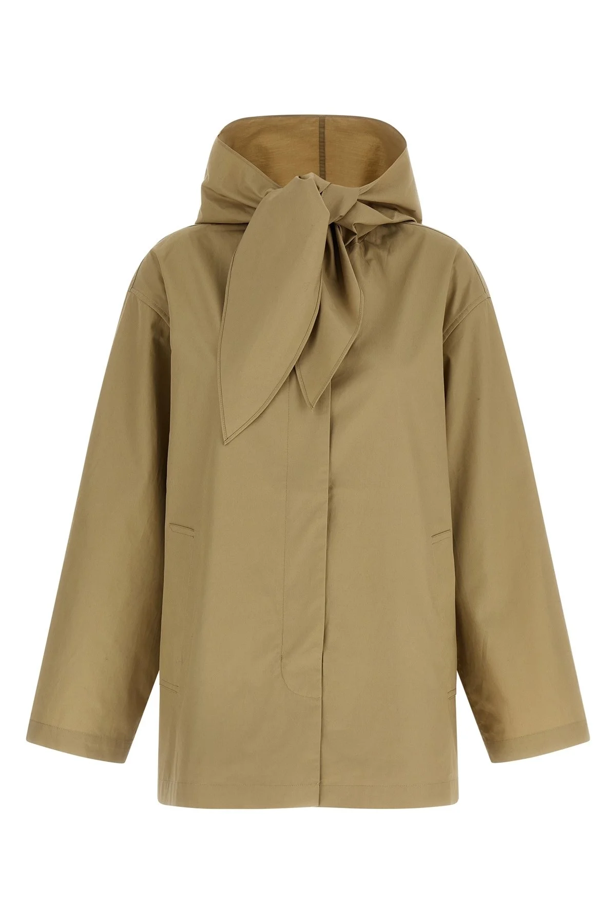 cod. 262WRO0292FB0633144 'Technical sacarf jacket cashew' lightweight rainproof cotton jacket with hood with front knotted scarf details, front zip closure and tie-up ties, side welt pockets, long sleeves with adjustable tabs with snap cuffs. Color: Beige Size & Fit: True to size fit Composition: 100% cotton Made in: China