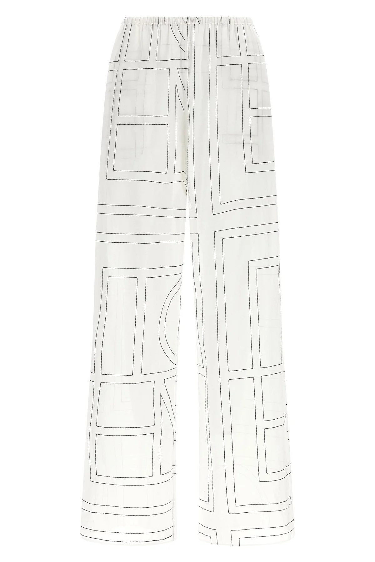 cod. 243WRB1092FB0239200 'Toteme' light cotton blend pants embroidered with contrast black thread monogram pattern, pajama style, wide and straight leg, elastic waistband, pockets. This product is made with craft techniques, possible variations between one item and another are to be considered characteristics of the product. Color: White/Black Size & Fit: true to size fit - FRENCH size Composition: 50% cotton 50% lyocell Made in: China