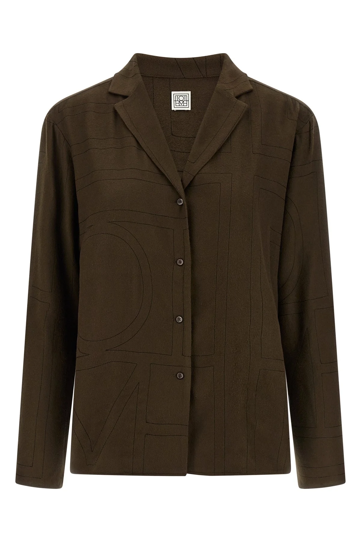 cod. 251WRT976FB0080034 Toteme' embroidered modal flannel shirt with contrast black thread monogram pattern, pajama style with V-neck, front button closure, long sleeves with dropped shoulders. This product is made with craft techniques, possible variations between one item and another are to be considered characteristics of the product. Color: Brown Size & Fit: oversized fit - FRENCH size Composition: 100% Lenzing TENCEL™ modal Made in: China