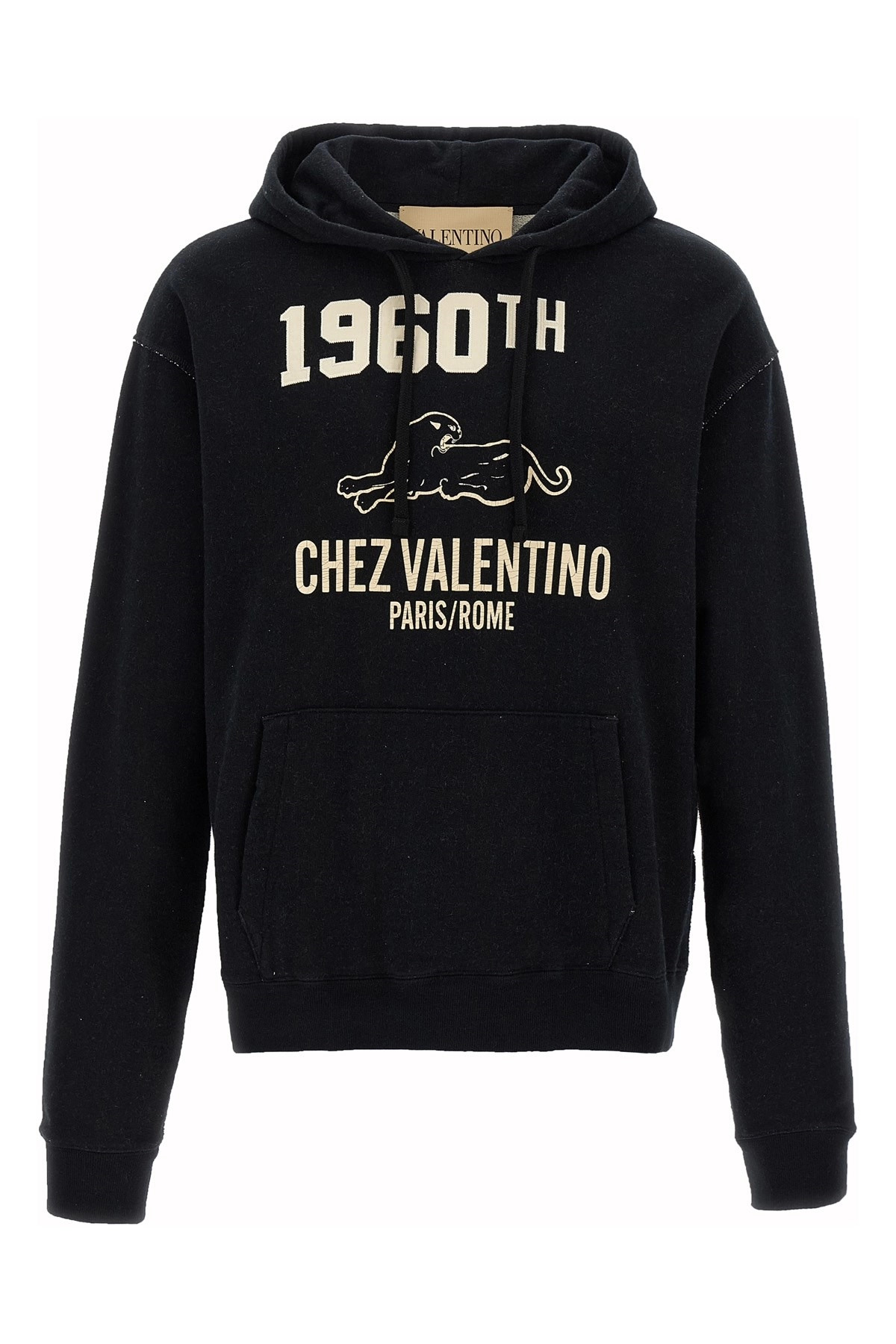 cod. V3MF29MB1M9RA Valentino Garavani hoodie with front 'Chez Valentino' print and patch, kangaroo pocket, long cuffed sleeves. Color: Black Size & Fit: True to size fit Composition: 100% cotton Made in: Italy