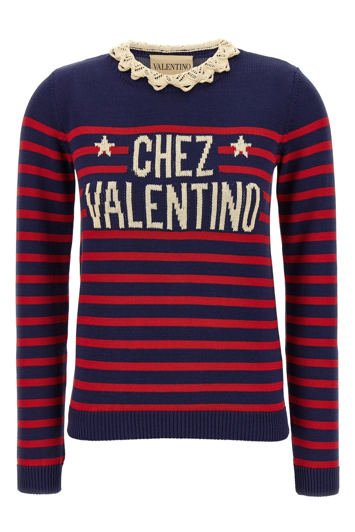 cod. B3KC67D9KEBP3 Striped cotton sweater with front jacquard 'Chez Valentino' pattern, round neckline with crochet ruffles, long cuffed sleeves. Color: Blue Size & Fit: true to size fit Composition: 100% cotton Made in: Italy