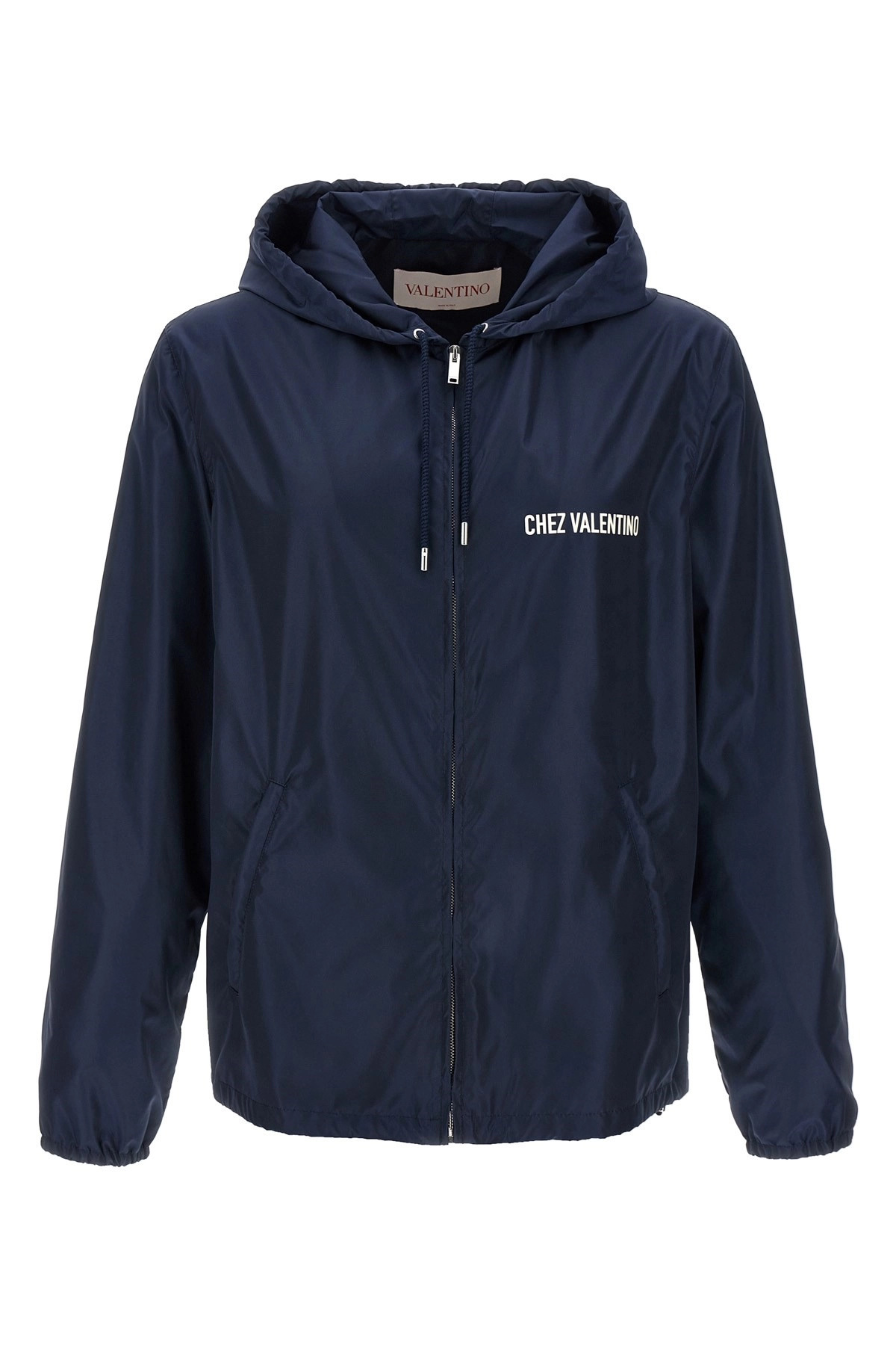 cod. V3CI3486FNAF9 Nylon anorak with 'Chez Valentino' print on the front and back, hood with adjustable drawstring, zip closure, pockets, long sleeves with elastic cuffs, drawstring at the hem. Color: Blue Size & Fit: Slim fit Composition: 100% polyamide Made in: Italy