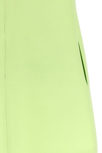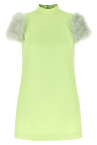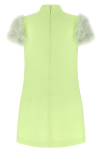 cod. B3VAJ901CFC9E Wool crepe mini dress with high neck, trapeze style, short feathered sleeves, concealed zip back closure. Color: Green Size & Fit: True to size fit Composition: 65% virgin wool 35% silk Made in: Italy