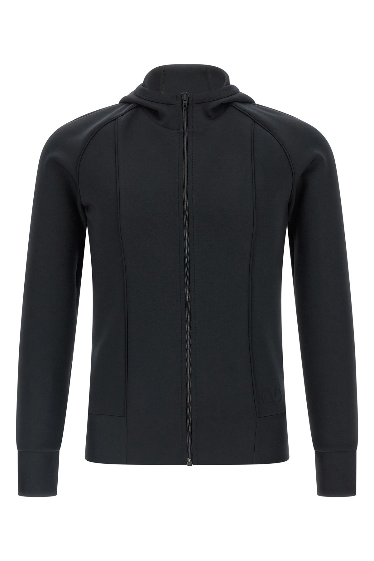 cod. V0MF29QB6G0NO Technical jersey hoodie with VLogo Signature 3D and front zip closure, high neck, pockets, long cuffed sleeves. Color: Black Size & Fit: true to size fit Composition: 91% polyester, 9% elastane Made in: Italy