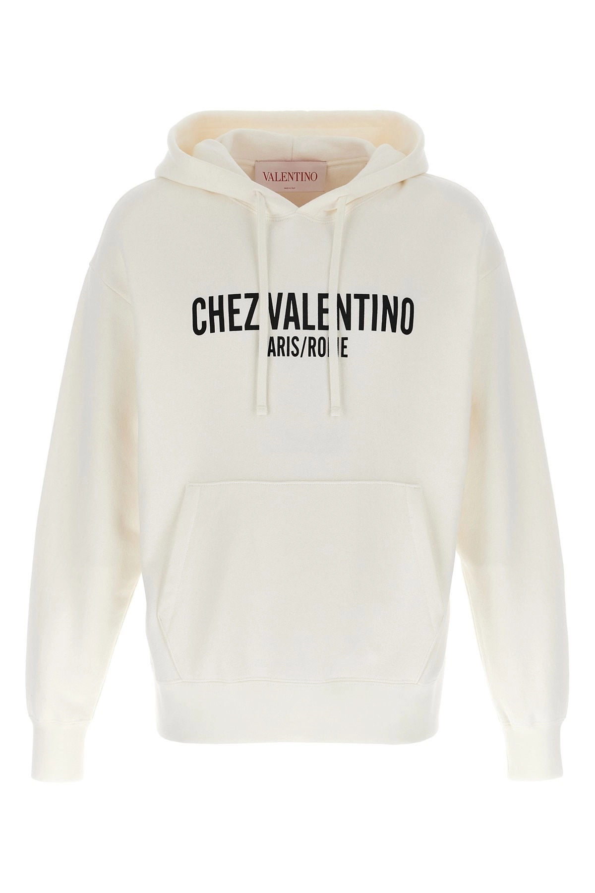 cod. V3MF28NAPJA03 Brushed cotton hoodie with front 'Chez Valentino' print, kangaroo pocket, long cuffed sleeves. Color: White Size & Fit: oversized fit Composition: 100% cotton Made in: Italy