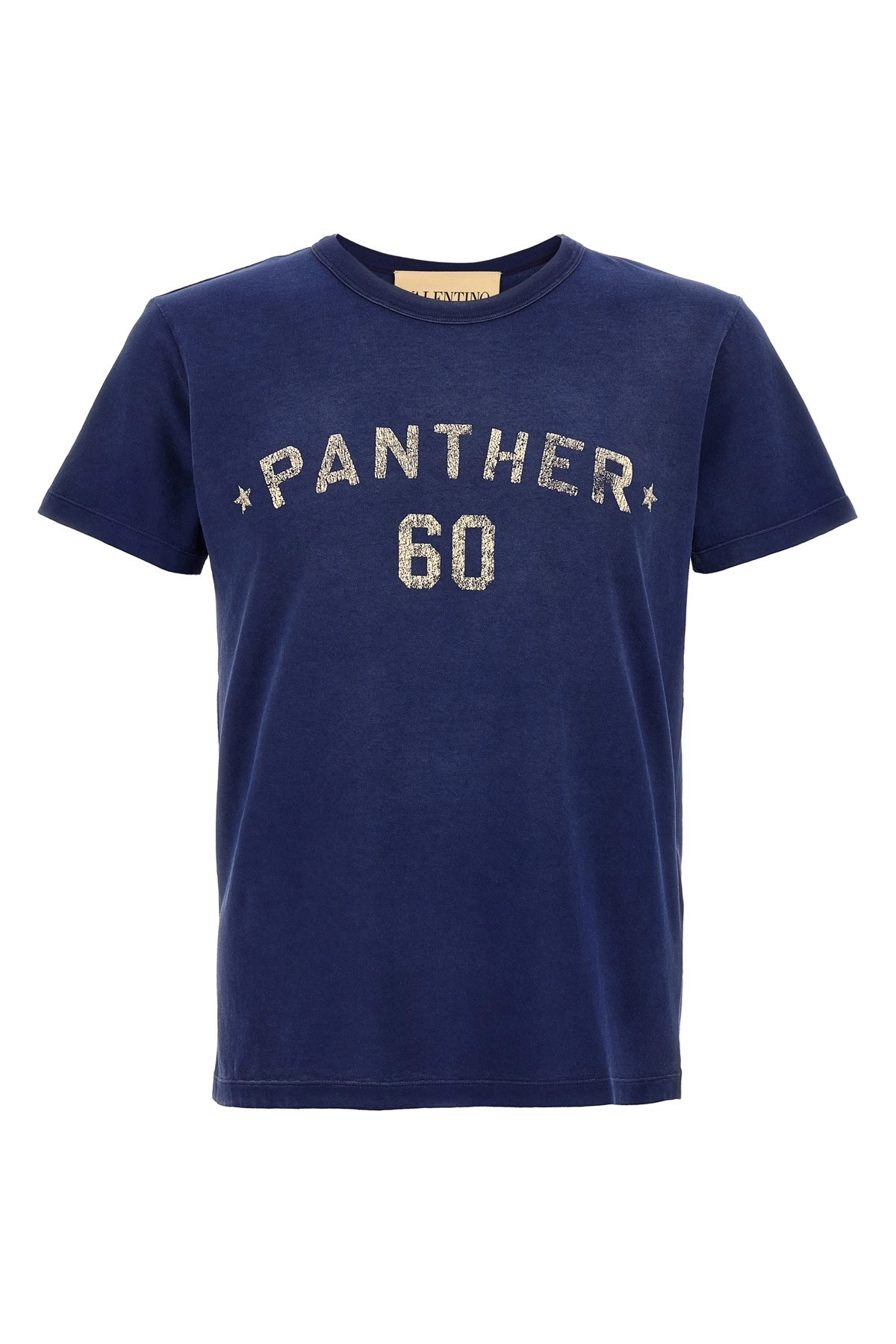 cod. V3MG17EAYDAEW Cotton jersey T-shirt with 'Panther' print on the front craque effect, 'Chez Valentino' patch on the back, crew neck, and short sleeves. Color: Blue Size & Fit: true to size fit Composition: 100% cotton Made in: Italy