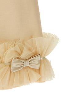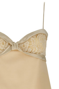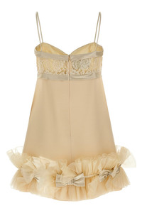 cod. B3VAHR01CFET5 Solid Crepe Couture mini dress with heart-shaped neckline with lace details and tone-on-tone satin bows, thin straps, sleeveless, pleated Taffetas ruffles and Satin Crepe bows, back zip closure, Habotai silk lining. Color: Beige Size & Fit: true to size fit Composition: 65% virgin wool 35% silk Made in: Italy