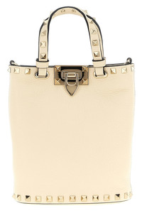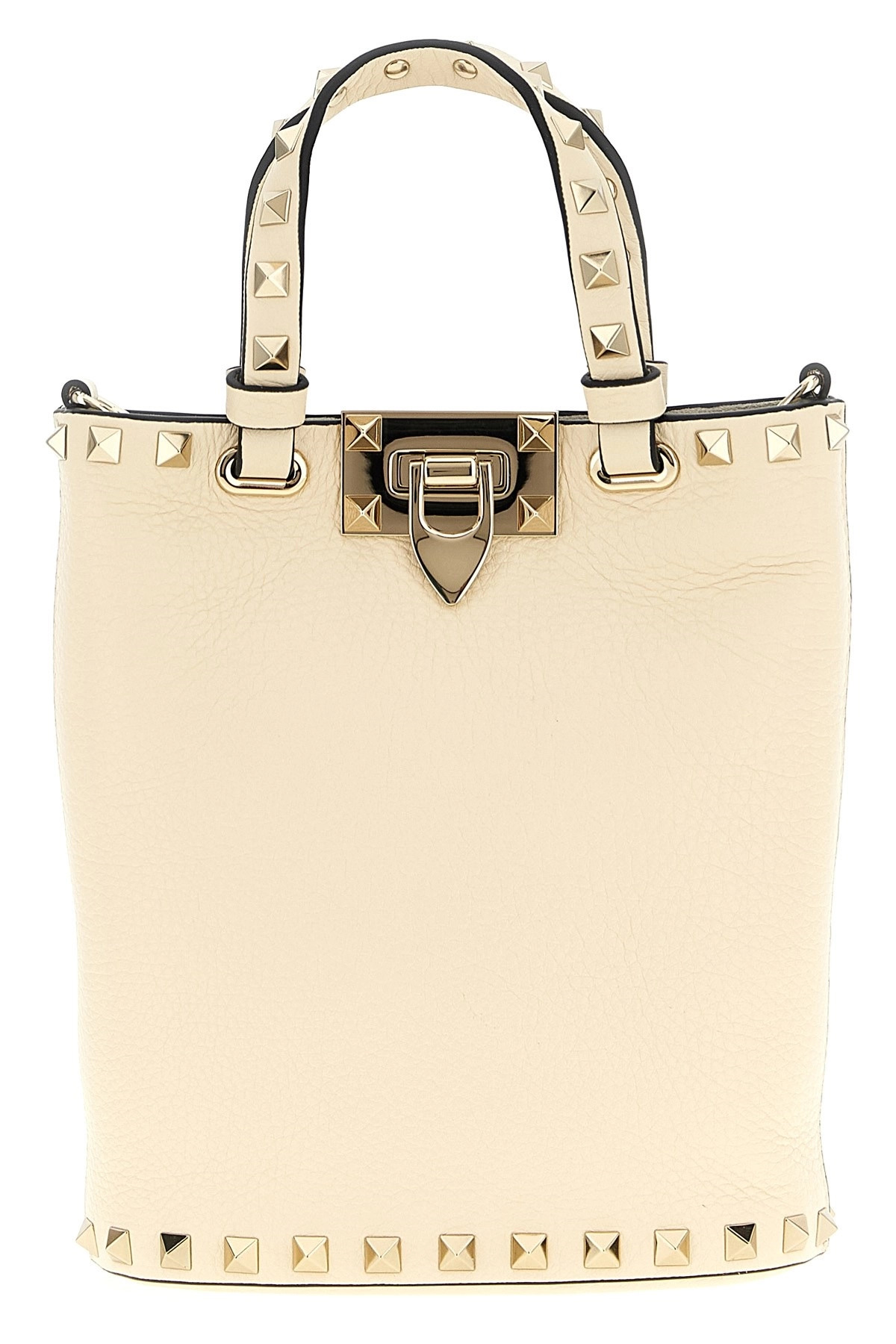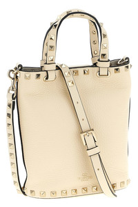cod. W2P0W31VSHI16 'Rockstud' pouch in grenade calf leather with metal stud applique, front embossed logo, double fixed handle, metal hook closure, removable shoulder strap. Color: White Size & Fit: W 18 x H 19 x D 8 cm Composition: 100% leather Made in: Italy