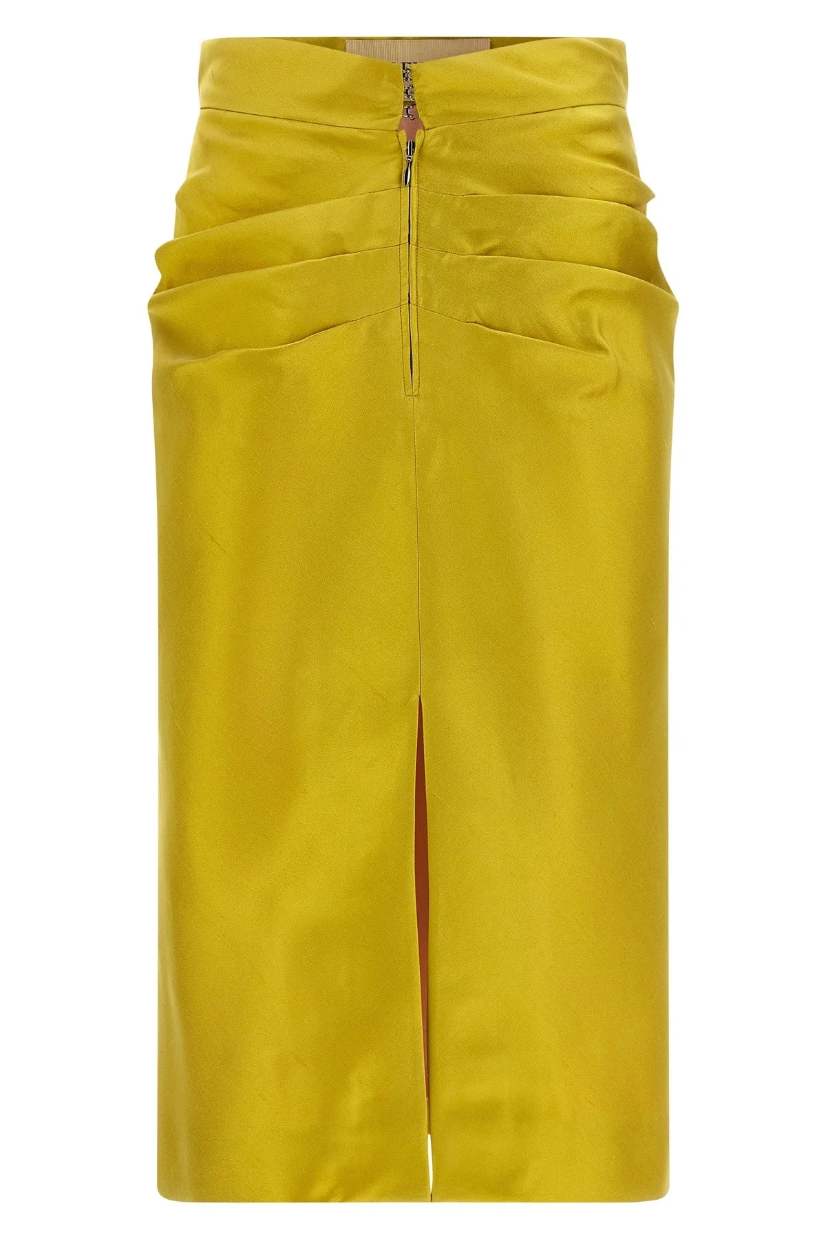 cod. B0RAEY59F3R0X Shantung silk midi skirt with sheath silhouette, V-shaped waist with pleat and draping on the front and back, zip and hook closure with wide front split, Fiore, Stripe and VLogo silk blend fdera. Color: Green Size & Fit: true to size fit Composition: 100% silk Made in: Italy