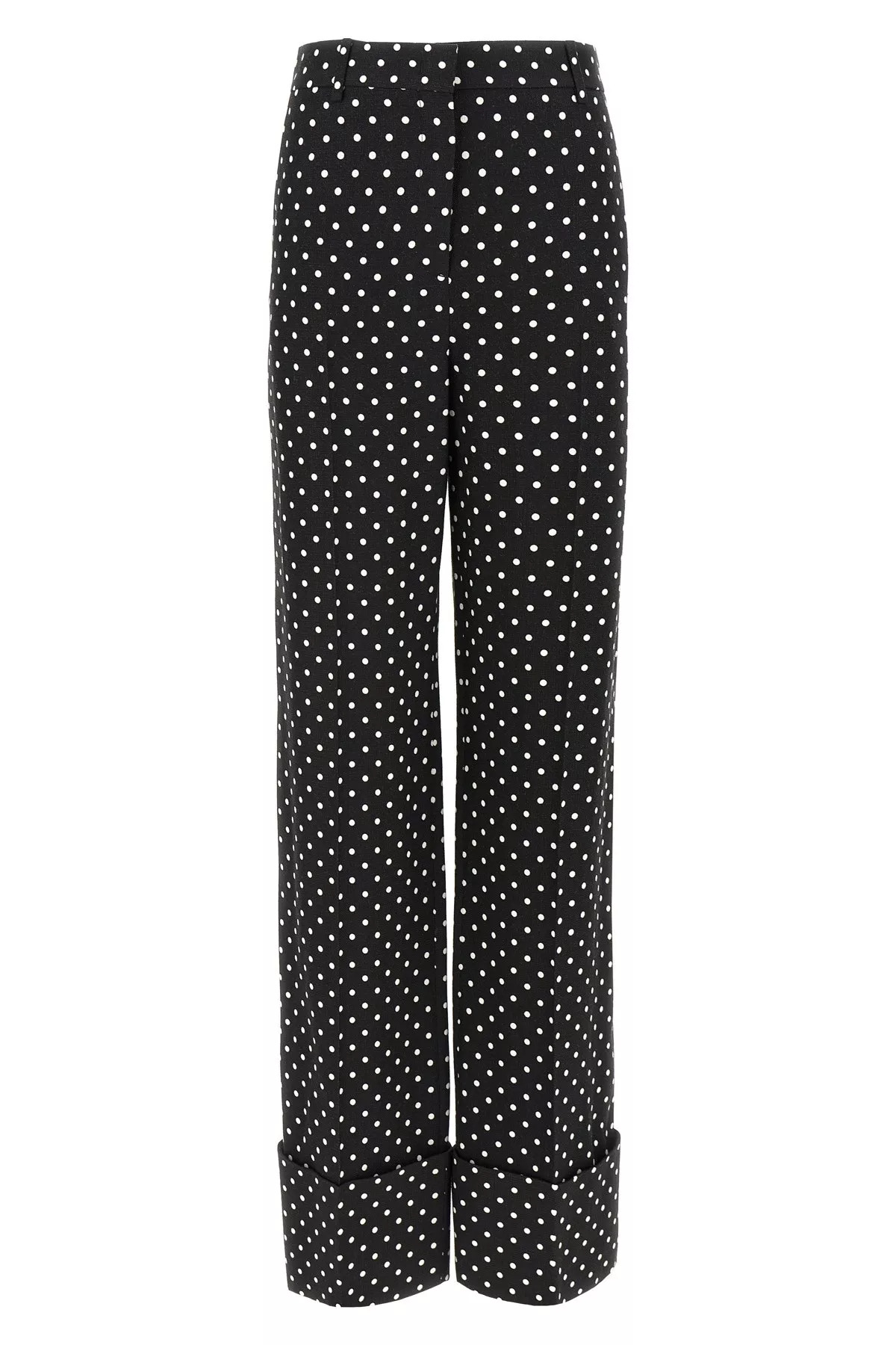 cod. 6B0RB6F098STB1 Plusdepolis Supergran print pants, wide leg, stretched pleat, hook and front button zip closure, pockets, maxi turn-up on the leg bottom. Color: White/Black Size & Fit: true to size fit Composition: 100% viscose Made in: Italy