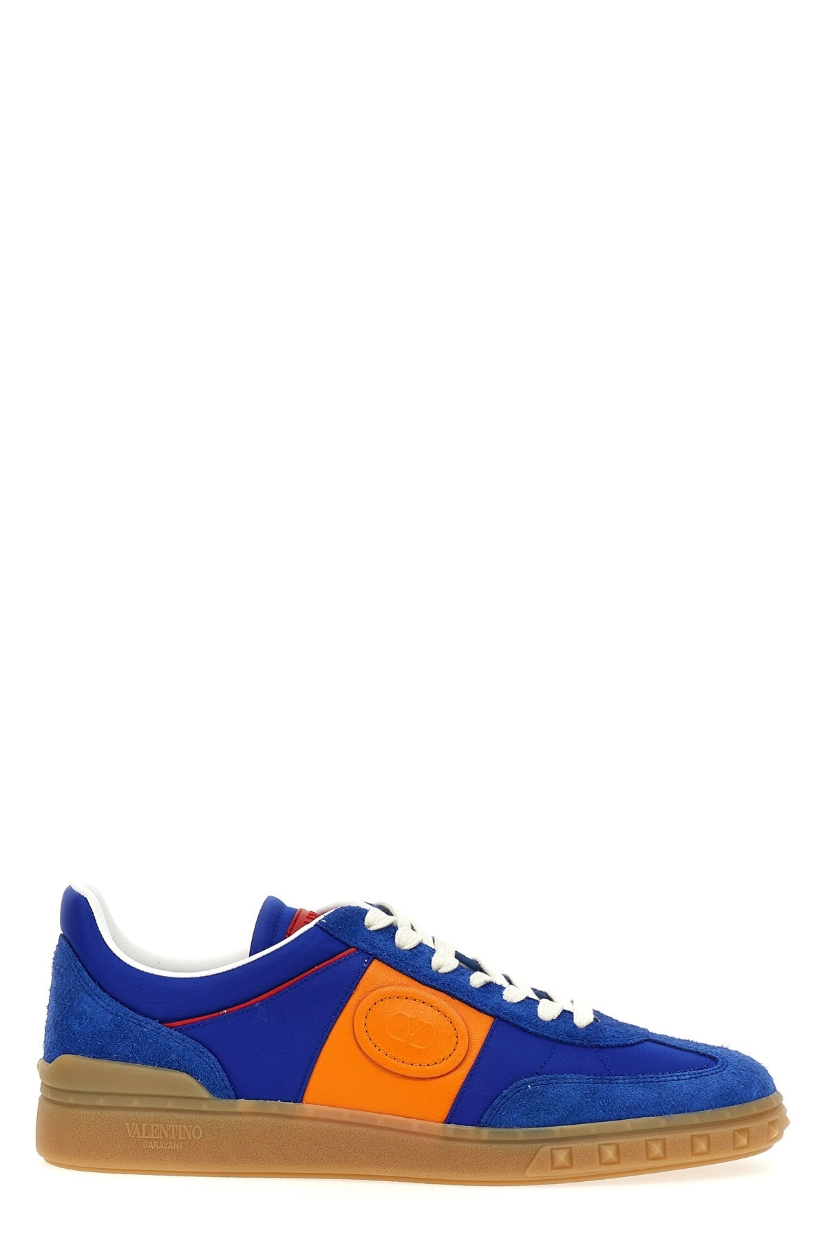 cod. Y2S0H77MBMRJ8 Valentino Garavani 'Upvillage' crust and nylon sneakers, contrast side band in napped calfskin with embossed 'Vlogo Signature', lace-up closure, rubber sole with studs. Color: Blue Size & Fit: EU MEN Composition: 100% bos taurus leather Made in: Italy