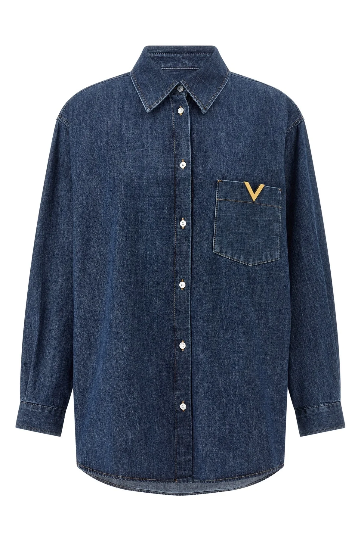 cod. B3DB03K9YA558 Solid Chambray cotton denim shirt with medium wash, contrast stitching, pocket with antiqued metallic VGold, front mother-of-pearl button closure, long cuffed sleeves, and asymmetrical hem. Color: Blue Size & Fit: true to size fit Composition: 100% cotton Made in: Italy