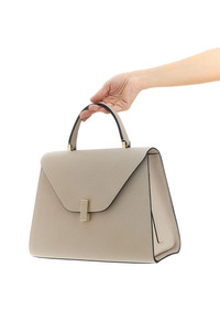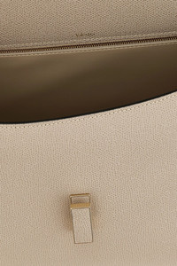 cod. WBES0070028LOC99PD 'Iside' large handbag in Millepunte calf leather, hand-lacquered Costa Valextra piping, fixed handle, flap closure with metal spin, rigid base with metal feet, adjustable and removable shoulder strap. Color: Beige Size & Fit: W 31 x H 23 x D 15.5 cm Composition: 100% calfskin leather (Bos Taurus) Made in: Italy