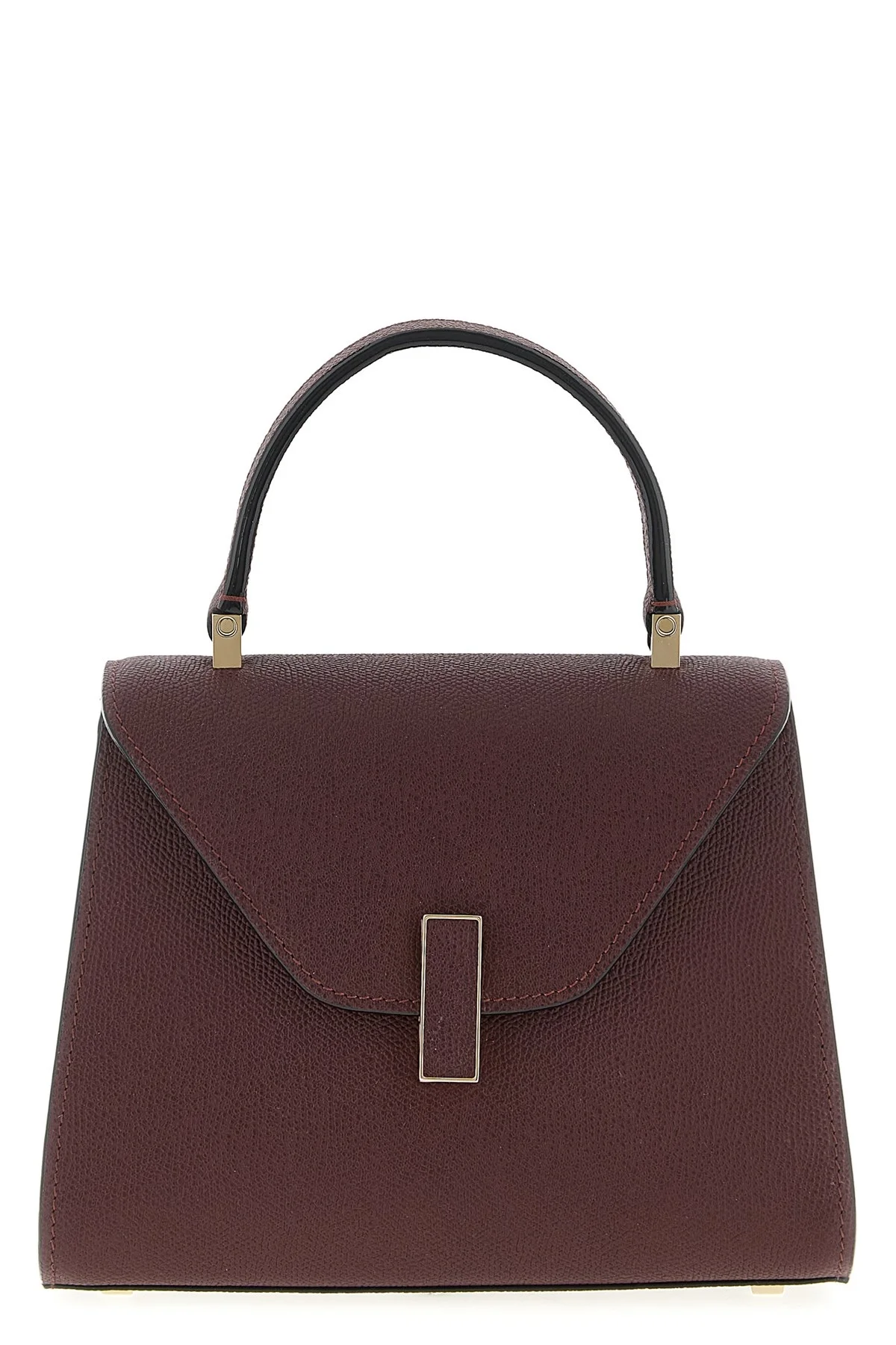 cod. WBES0036028LOC99RA 'Iside' mini handbag in Millepunte calf leather, hand-lacquered Costa Valextra piping, fixed handle, flap closure with metal spin, rigid base with metal feet, adjustable and removable shoulder strap. Color: Bordeaux Size & Fit: W 22 x H 16 x D 12 cm Composition: 100% calfskin leather (Bos Taurus) Made in: Italy