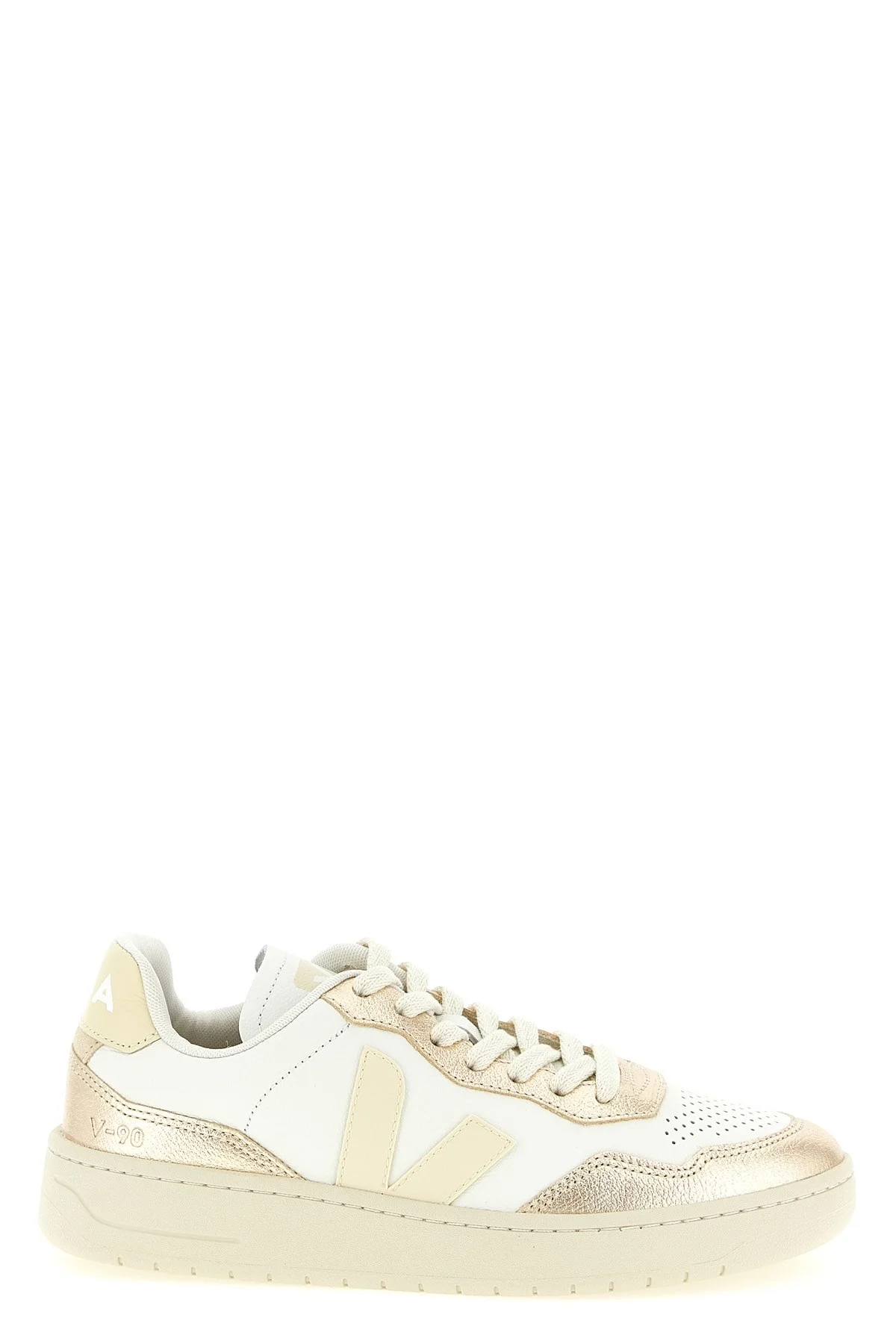 cod. VD2021362WHITECALCAIREPLATINE 'V-90' sneakers in hammered leather, suede and laminated leather, perforated toe, side rubber logo and contrast heel, lace-up closure, rubber sole. SUSTAINABLE: O.T. (Organic Traced) leather comes from 100% certified organic farms in Uruguay. Color: Gold Size & Fit: EU WOMEN Composition: 100% organic traced leather Made in: Brazil