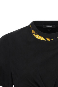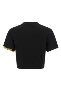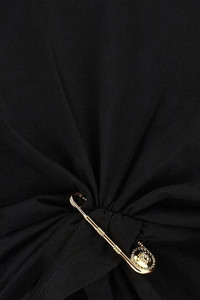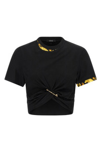 cod. 10209011A148331B000 Solid color cotton jersey T-shirt with double layer 'Barocco' print inserts, crop style with front metal 'Safety Pin' detail, crew neck, short sleeves. Color: Black Size & Fit: true to size fit Composition: 100% cotton Made in: Albania