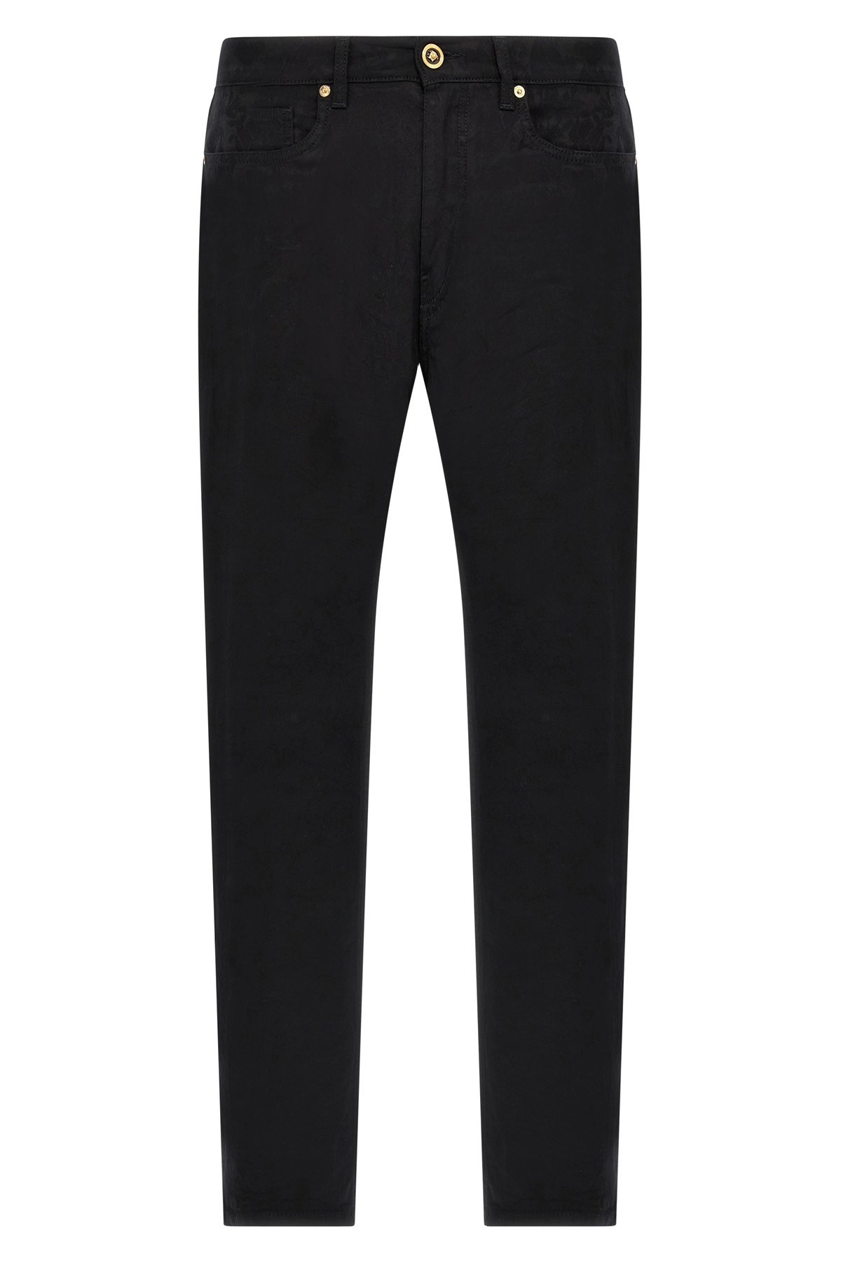cod. A818321A135771B000 Stretch cotton pants with 'Barocco' jacquard, leather logo tag with metallic Medusa at the back, zip and button closure, five pockets, metal details, straight leg. Color: Black Size & Fit: true to size fit Composition: 98% cotton, 2% elastane Made in: Tunisia