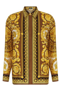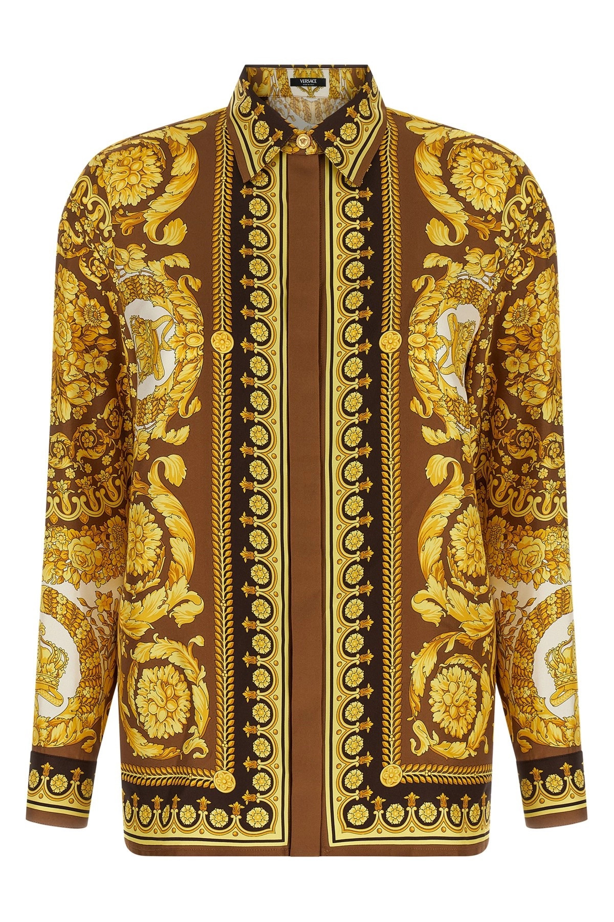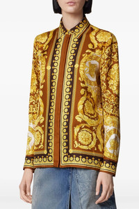 cod. 10013601A152155N790 All-over 'Barocco' print silk twill shirt, concealed front button closure, long cuffed sleeves. Color: Gold Size & Fit: true to size fit Composition: 100% silk Made in: Italy
