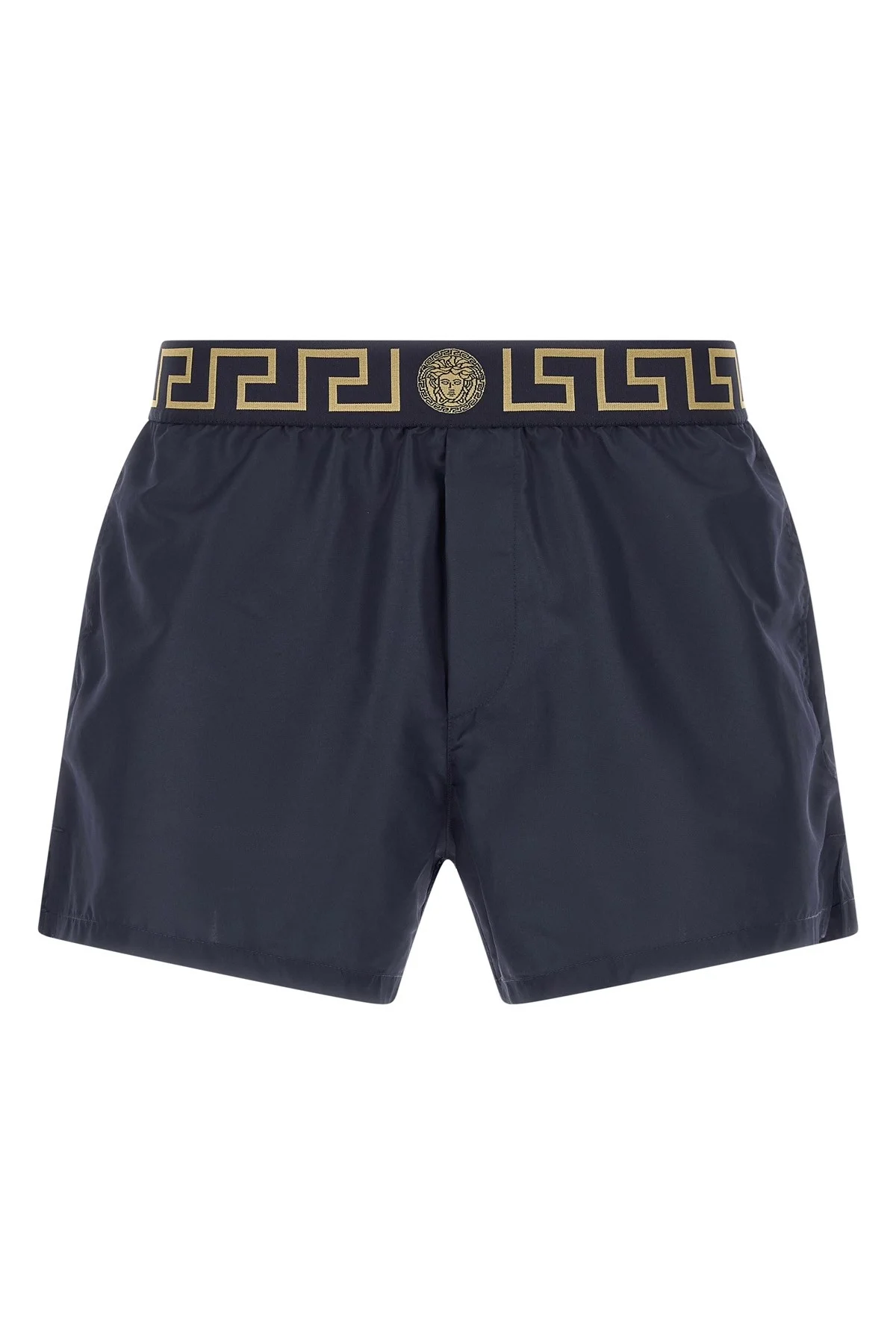 cod. ABU010221A11120A70W Nylon swimsuit with 'Greca' elastic waistband, pockets, inner mesh briefs. Color: Blue Size & Fit: True to size fit Composition: 100% polyester Made in: Italy