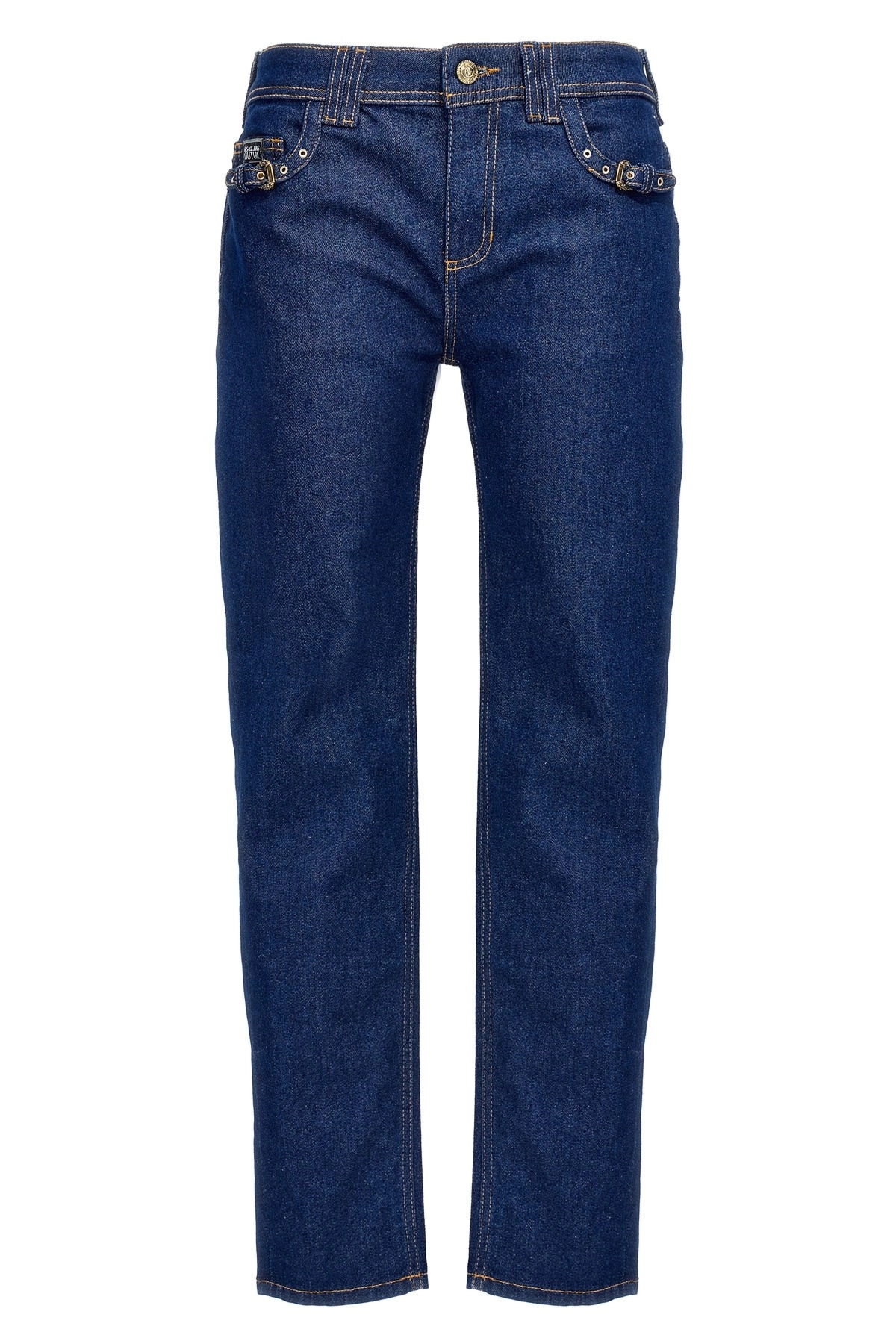 cod. 77HAB513DW023L01904 'Judy' stretch cotton denim jeans with zip and button closure, metal buckle details, five pockets, leather logo tag and metal logo plate. Color: Blue Size & Fit: Slim fit Composition: 98% cotton, 2% elastane Made in: Italy