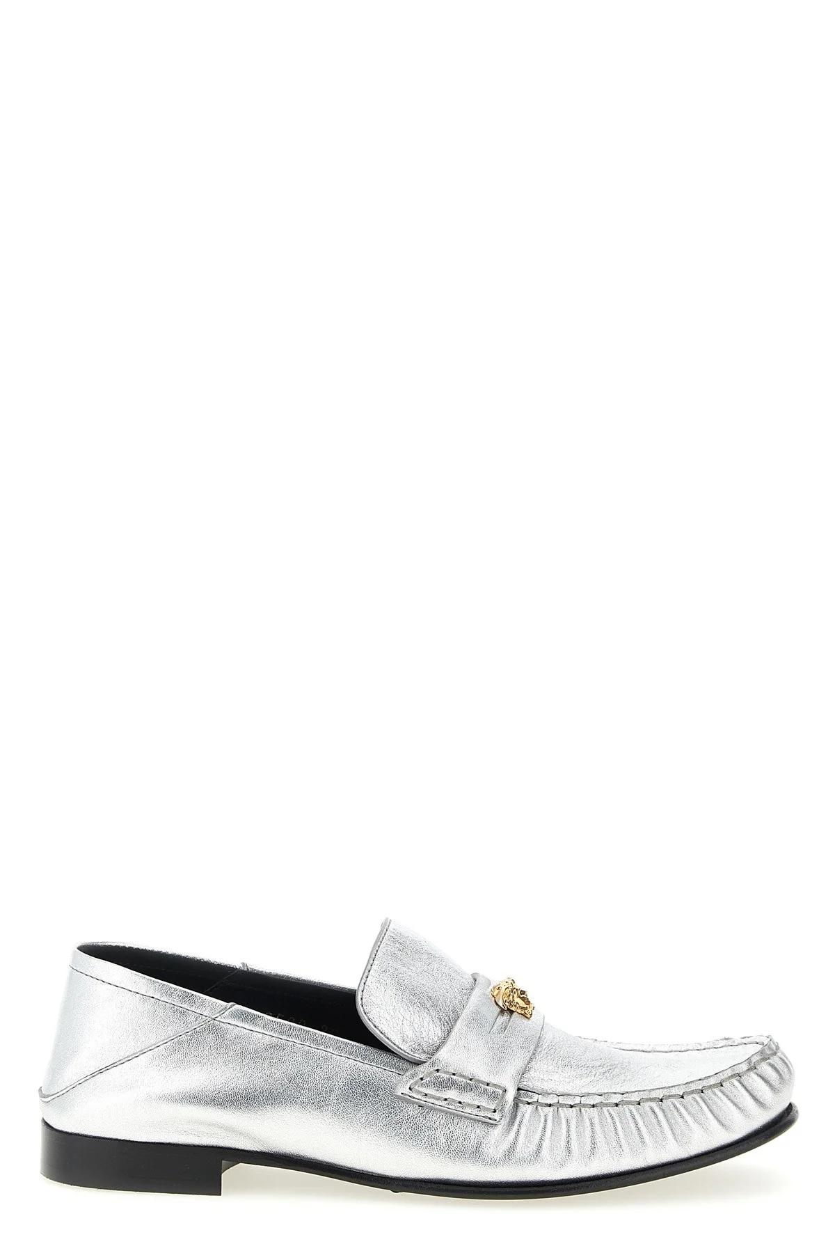 cod. 10225891A085391E01V Laminated nappa leather loafers with metal 'La Medusa' detail, front curled stitching, and leather sole. Color: Silver Size & Fit: EU WOMEN Composition: 100% lamb leather (Ovis aries) Made in: Italy