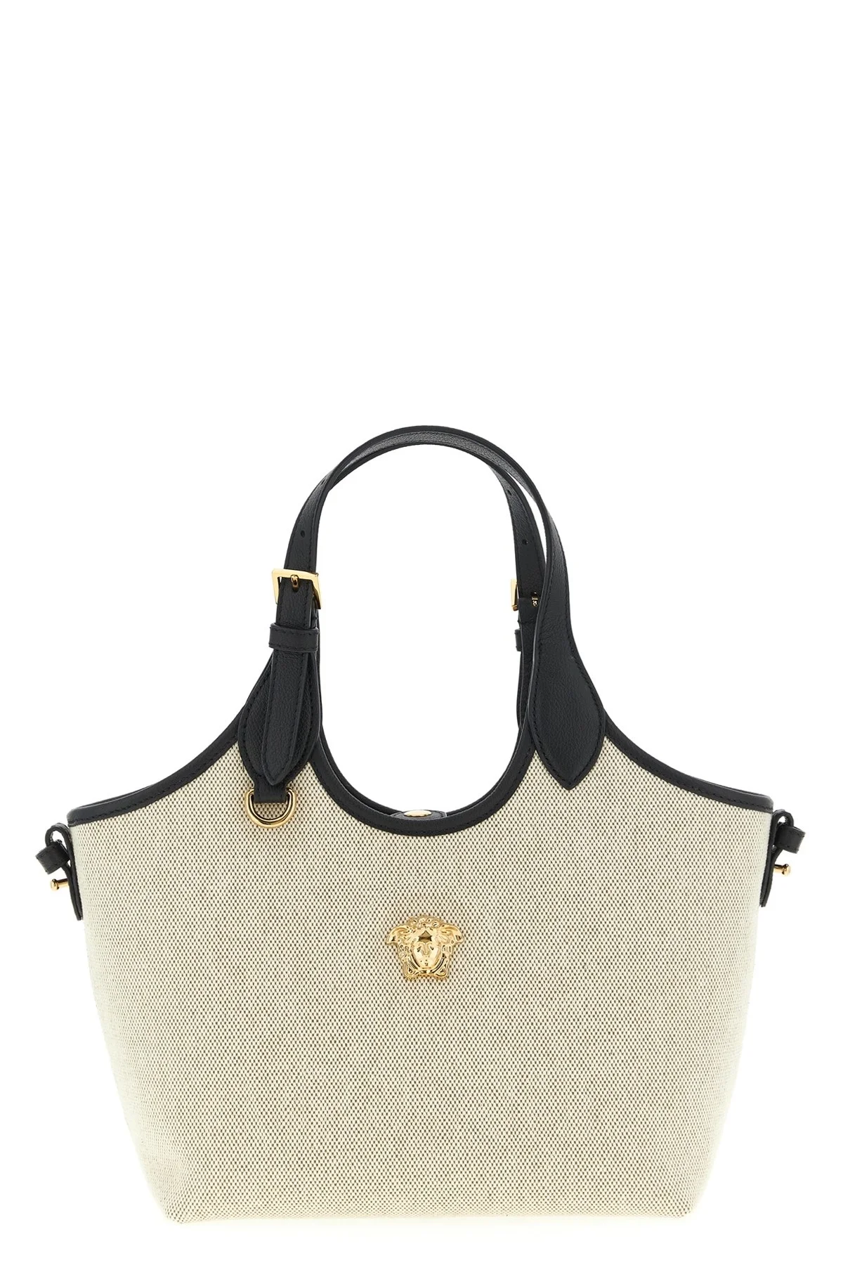 cod. 10225851A034942K86V Canvas mini shopping bag with contrast leather details, metal 'La Medusa' detail and front 3D logo, double adjustable handle, internal snap button closure, rigid base with metal feet, adjustable and removable shoulder strap. Color: Beige Size & Fit: W 36.5 x H 31 x D 11 cm Composition: 100% cotton Made in: Italy