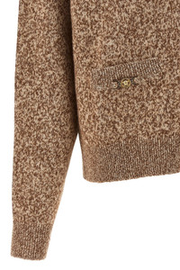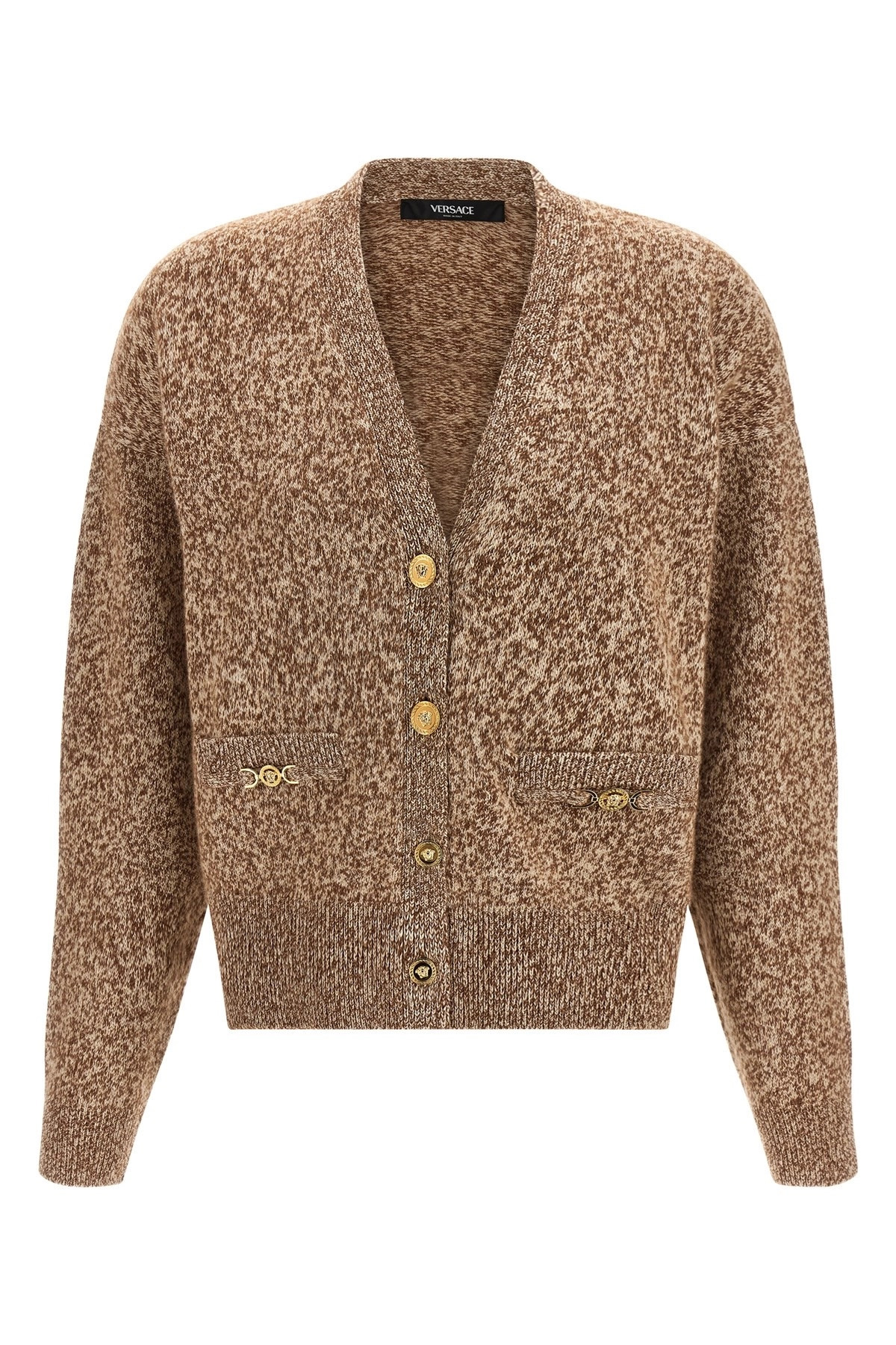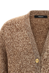 cod. 10134371A154512NG70 Mouline wool and cashmere blend cardigan, front 'Medusa '95' metal button closure, V-neck, pockets, long cuffed sleeves and dropped shoulders. Color: Beige Size & Fit: Boxy fit Composition: 56% wv, 24% ws, 20% se Made in: Italy