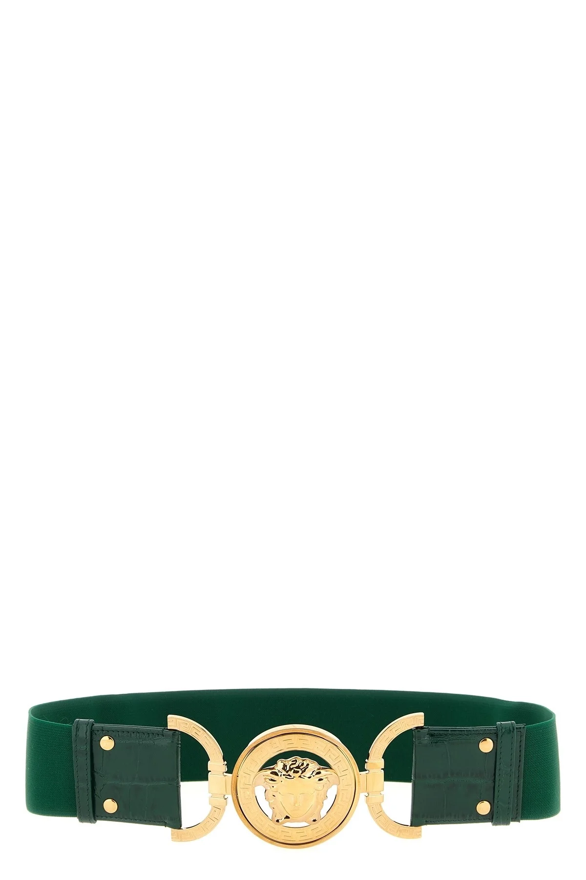 cod. 10165331A170561GJ1V Elastic belt with tone-on-tone coconut-effect calf leather details and 'Medusa '95' snap metal buckle. Color: Green Size & Fit: H 6 cm Composition: 100% calfskin leather (Bos Taurus) Made in: Italy