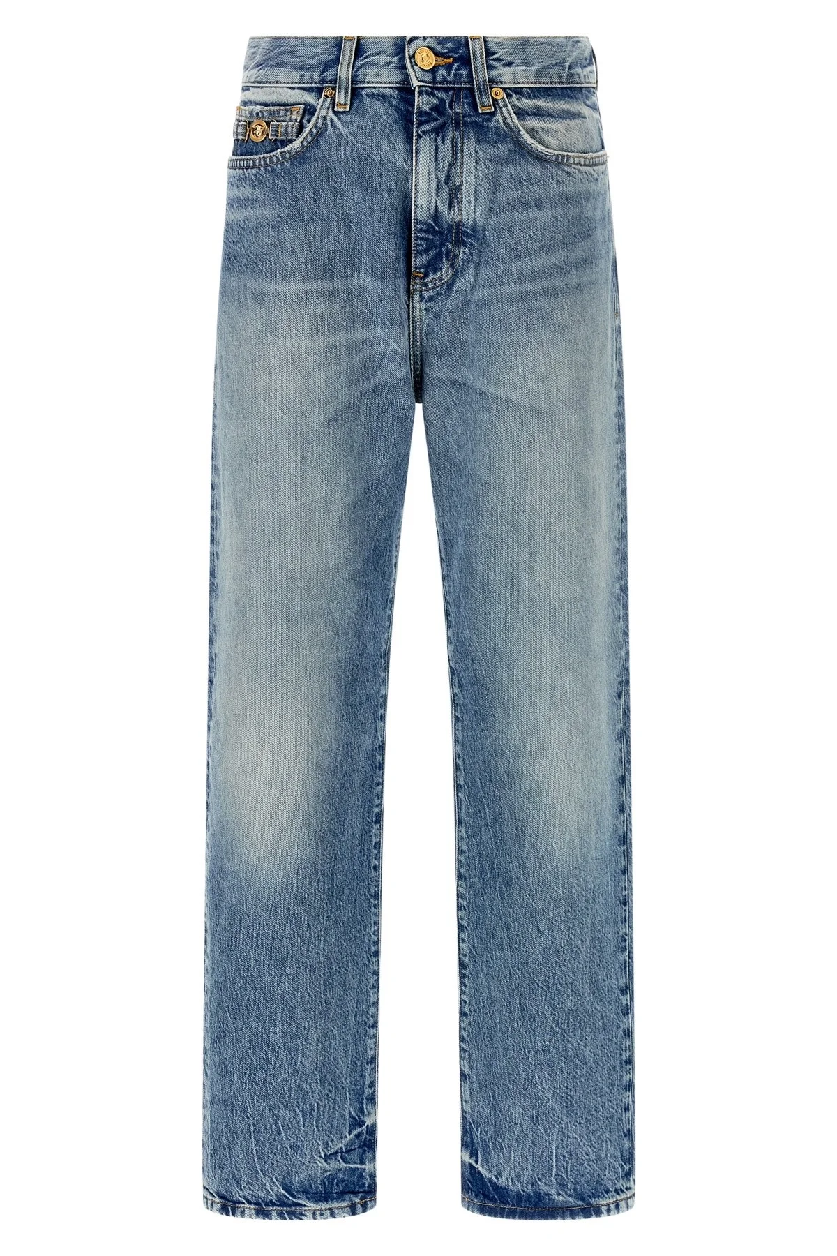 cod. 10205761A163861D190 Stonewashed cotton denim jeans with contrast stitching, Medusa Biggie metal detail on the front, straight leg, zip and button closure, five pockets, back leather logo tag, distressed piping leg bottoms. Color: Blue Size & Fit: Pencil fit Composition: 100% cotton Made in: Tunisia